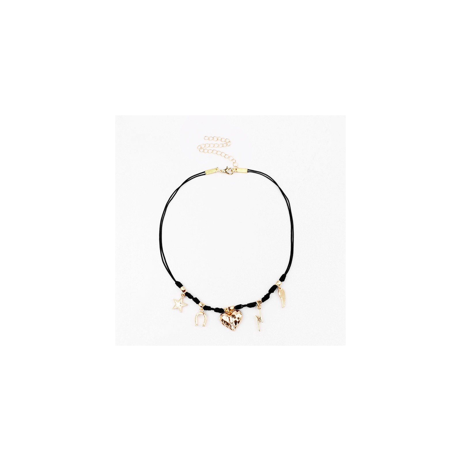 Collar corto de hilo con múltiples charms exclusivos de distintas formas y tamaño dorados.