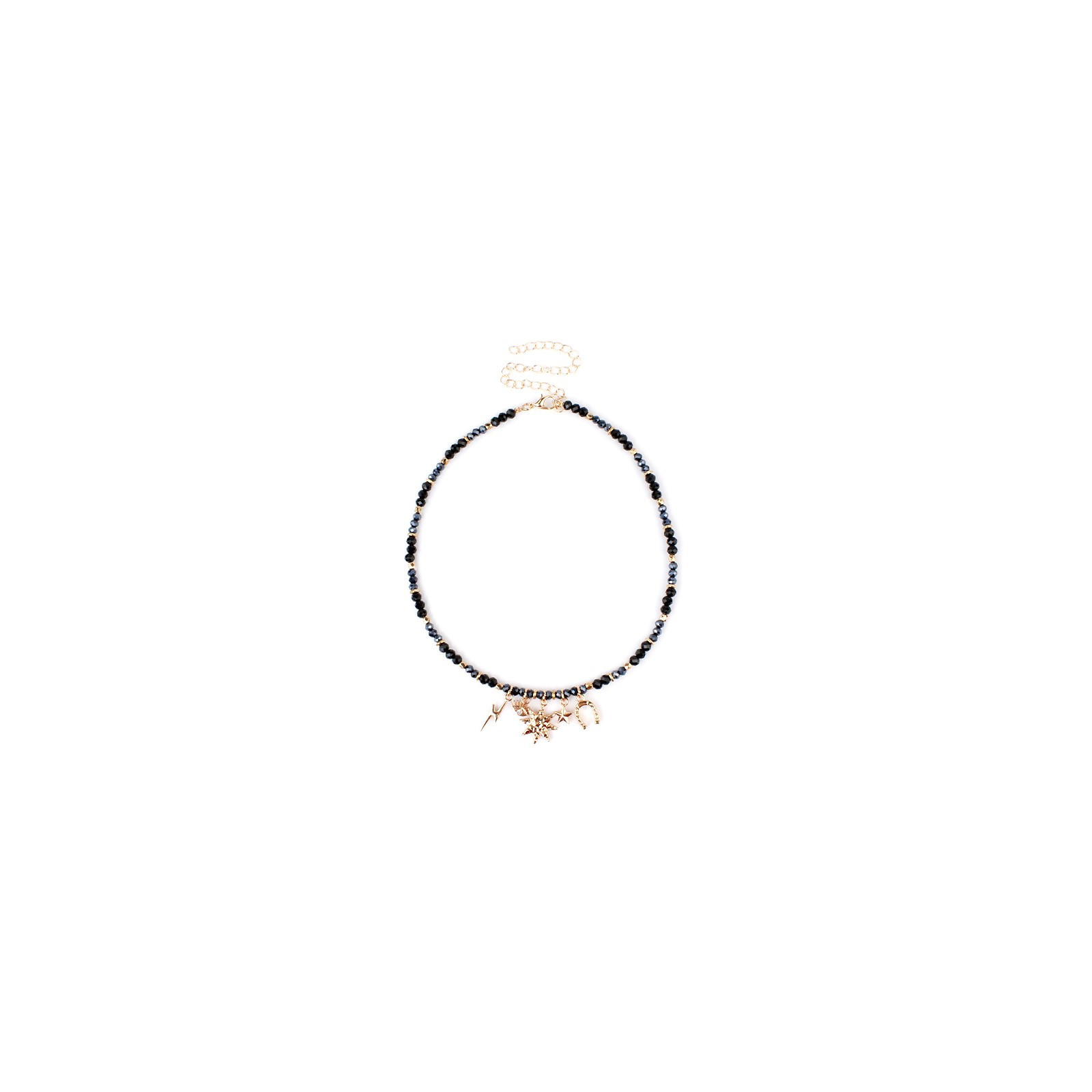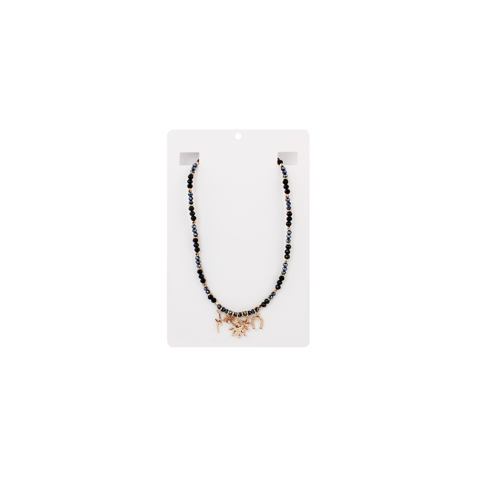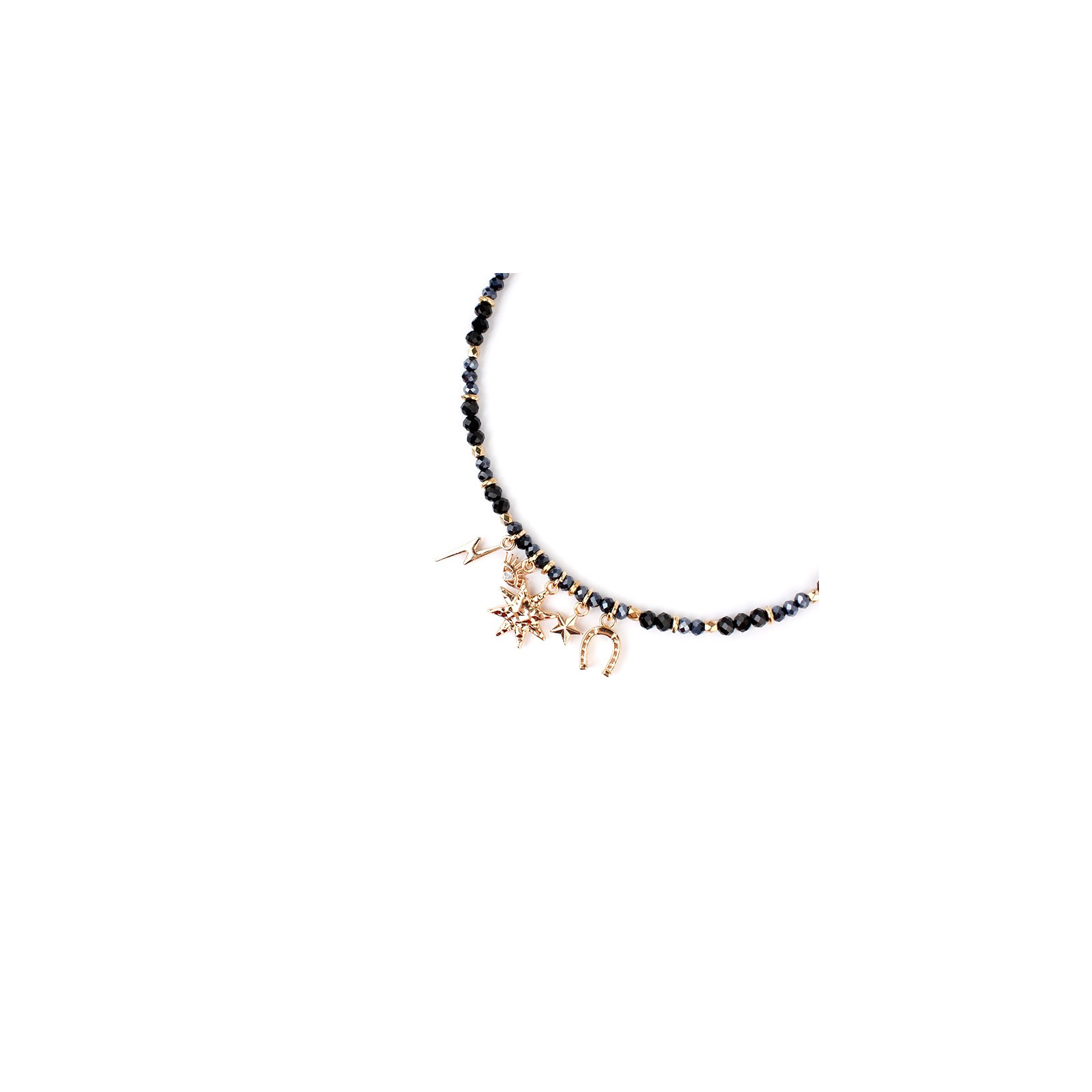 Collar de rocas de cristal con múltiples charms exclusivos de distintas formas y tamaños dorados.