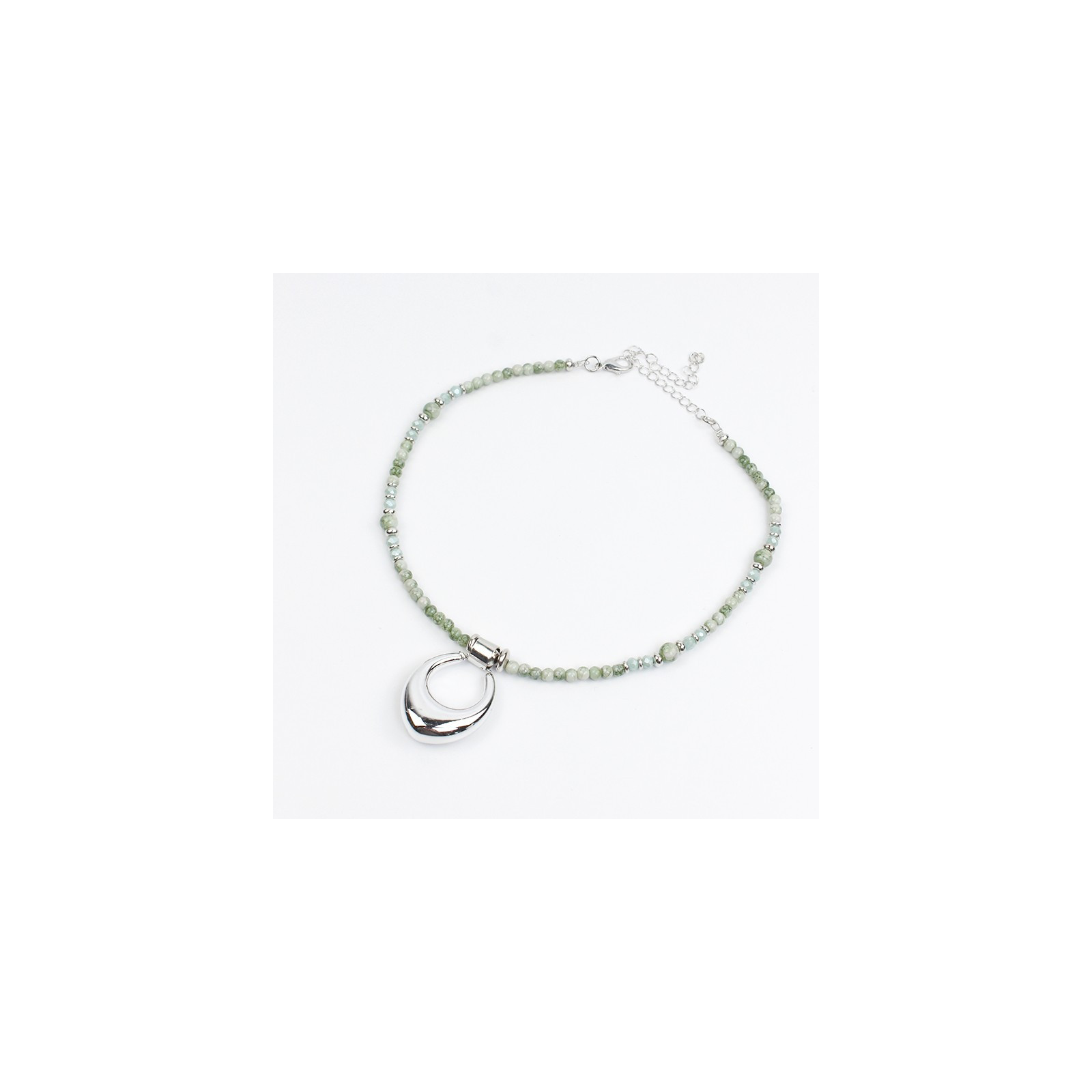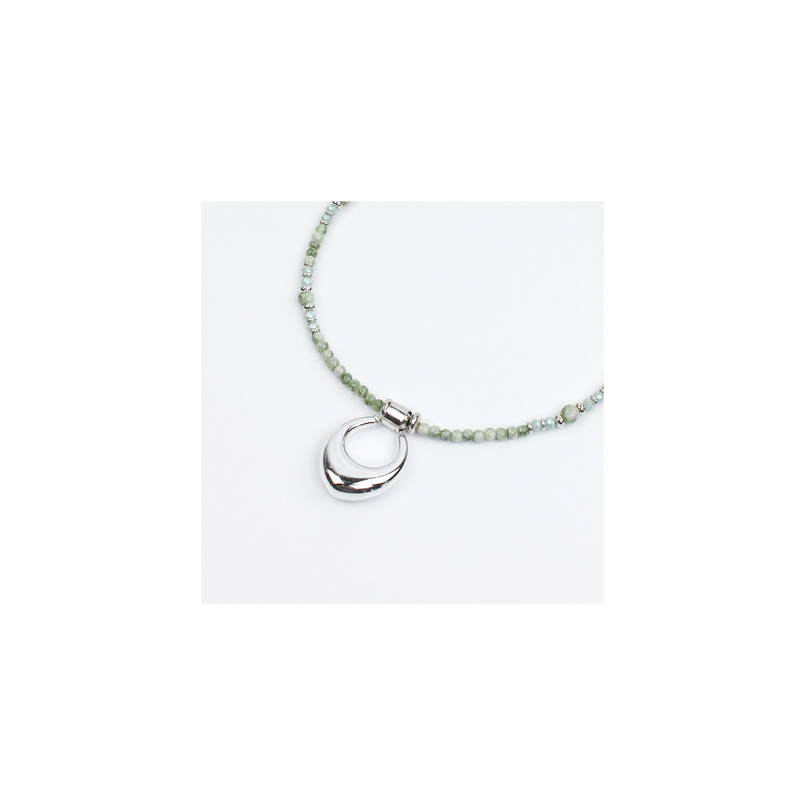 Collar combinado con rica de cristal, bolitas de vidrio marmoladas de distintos tamaños y piezas pasantes de CCB, con dije exclusivo de CCB con forma orgánica.