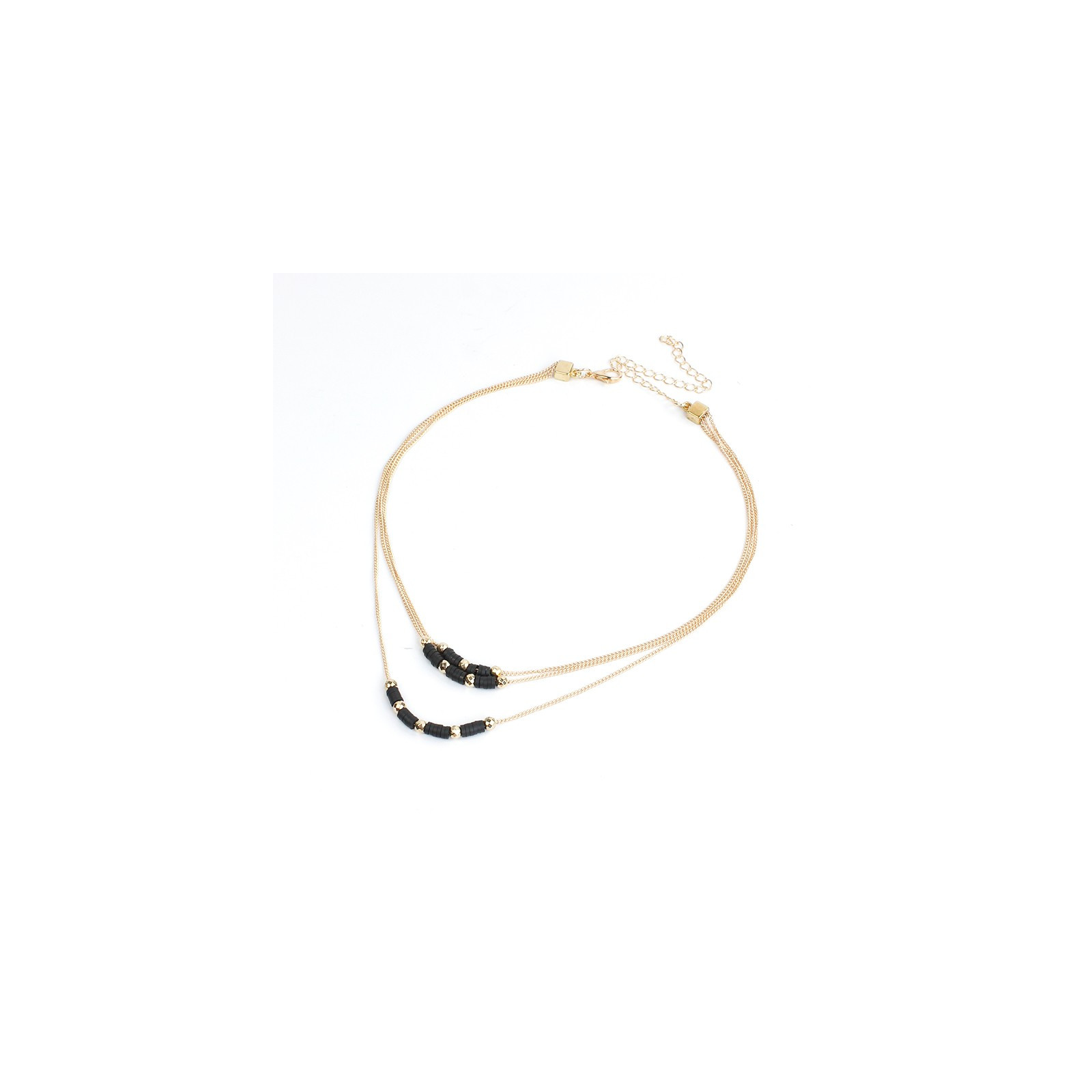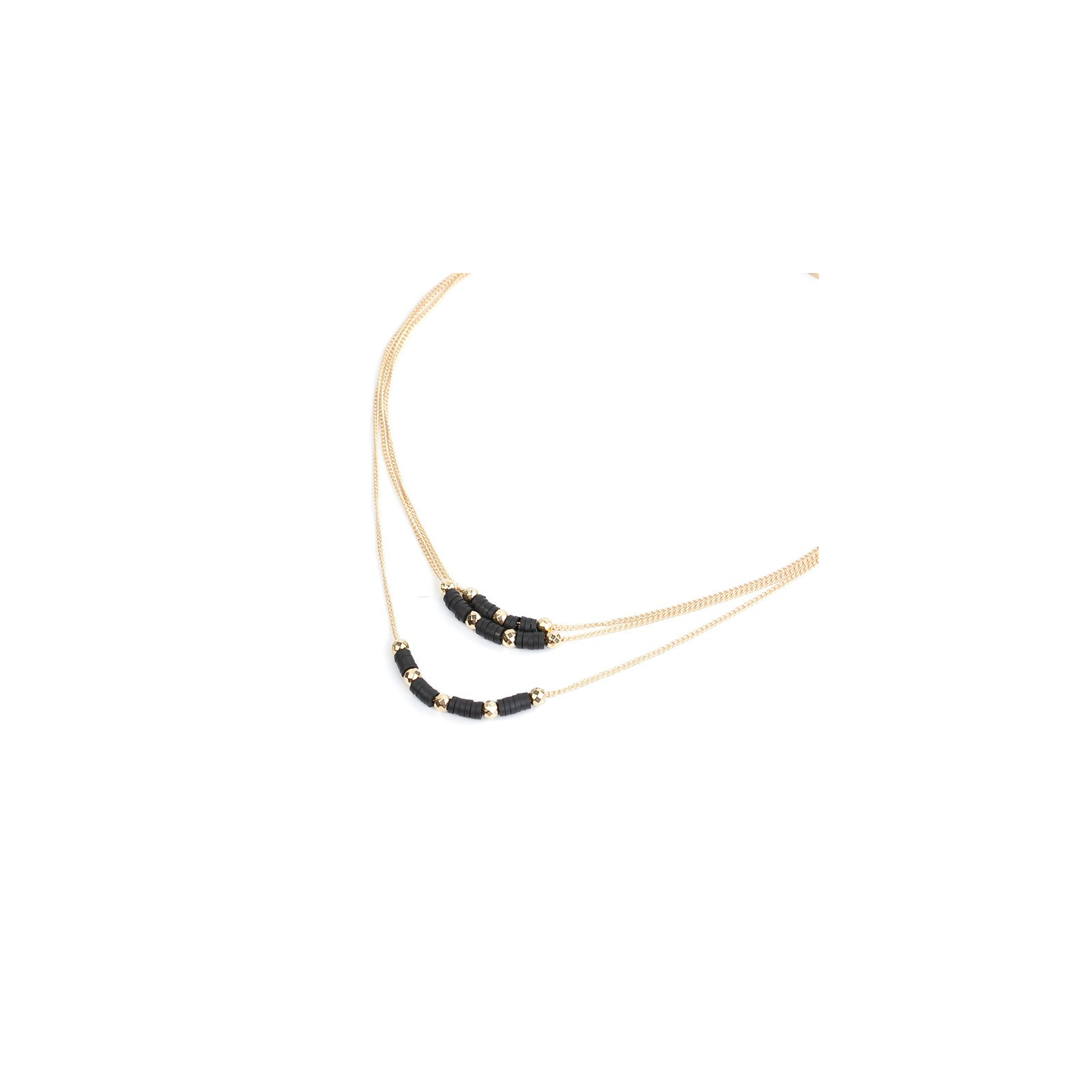 Collar de triple caída de cadenas diferenciadas, intervenidas con piezas pasantes de CCB dorado y fimo perlado.