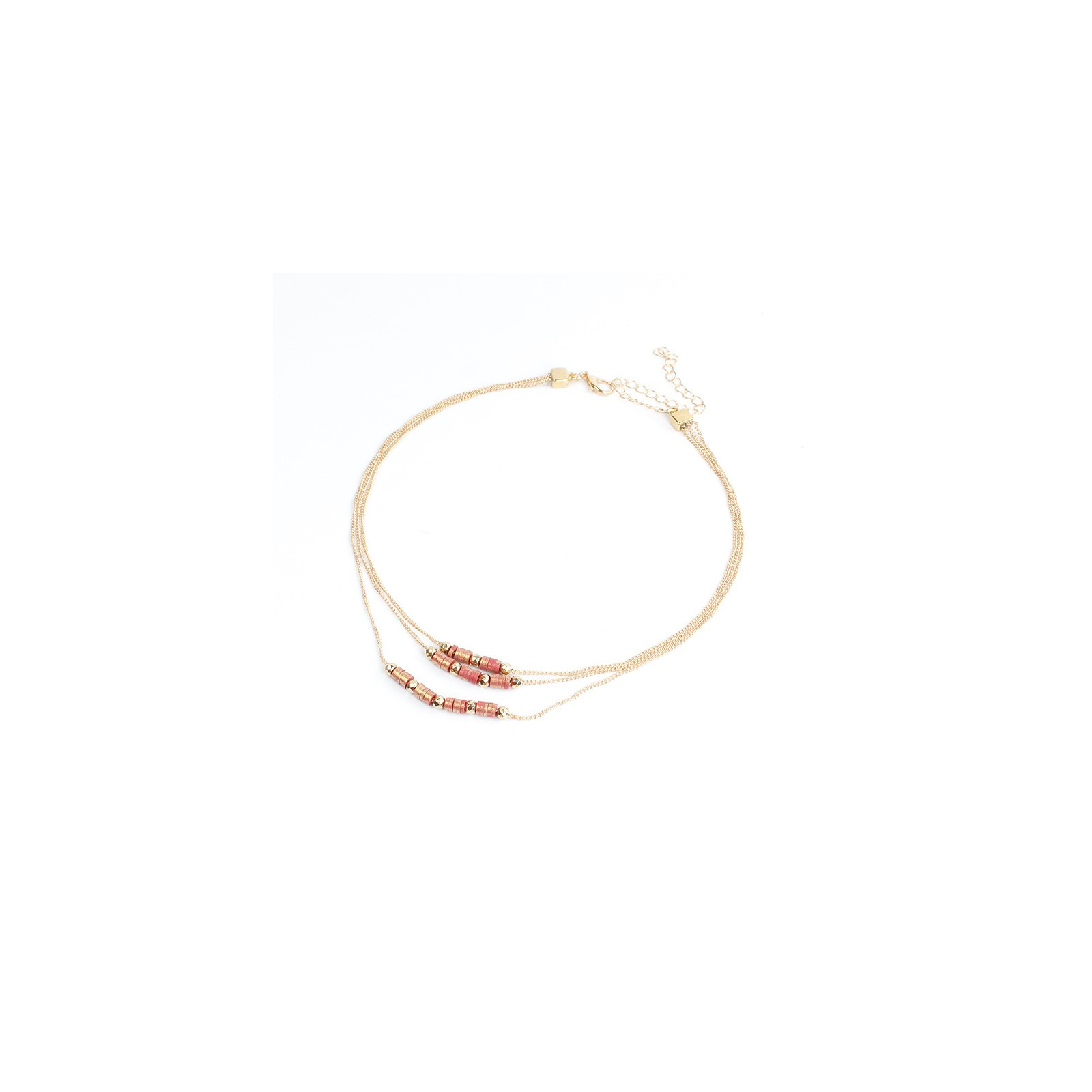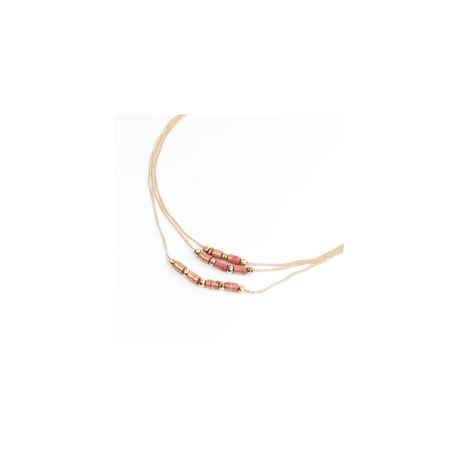 Collar de triple caída de cadenas diferenciadas, intervenidas con piezas pasantes de CCB dorado y fimo perlado.