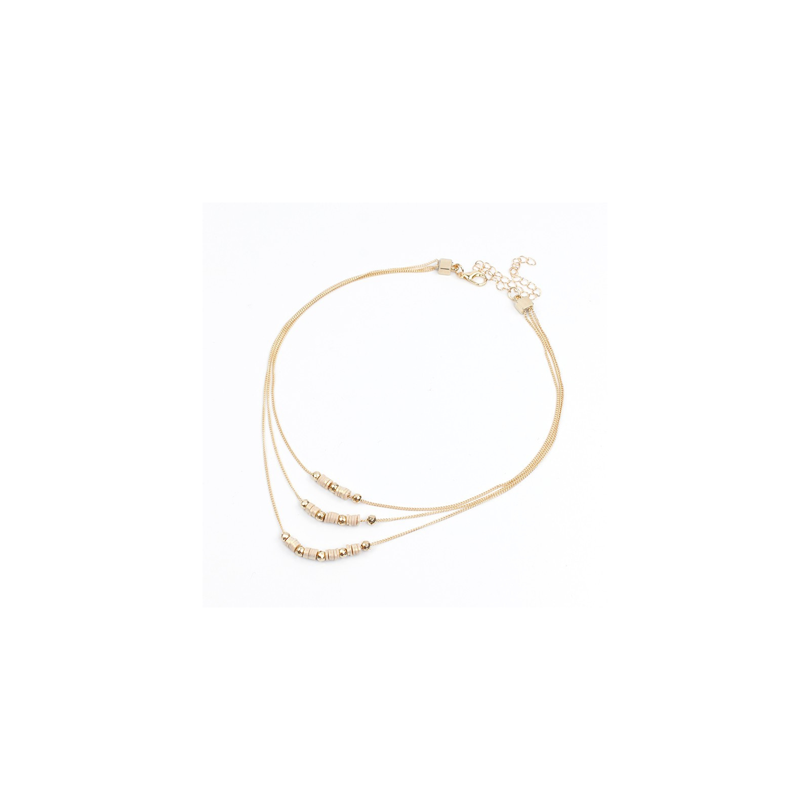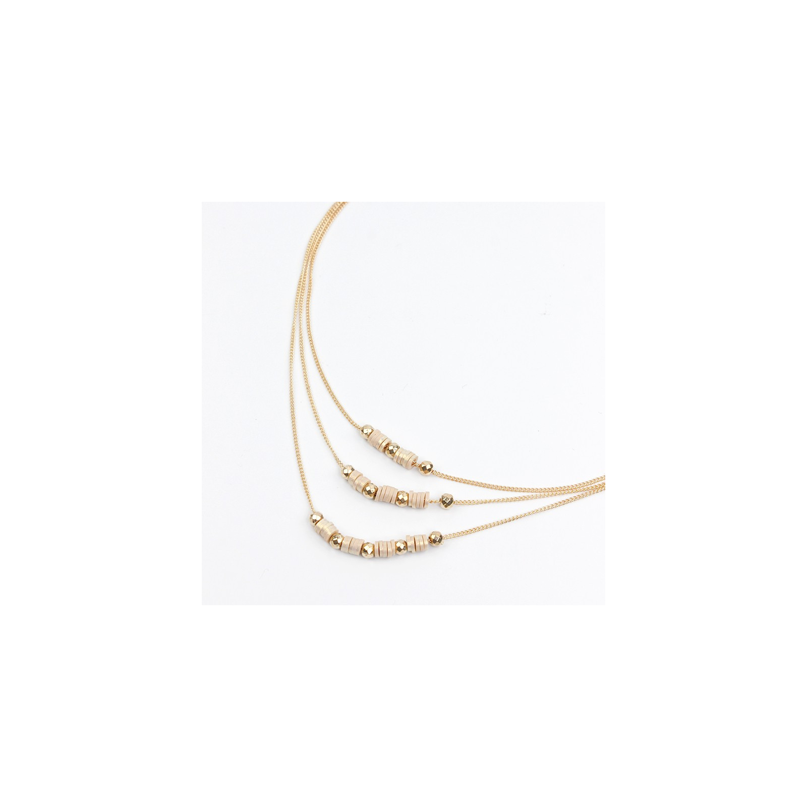 Collar de triple caída de cadenas diferenciadas, intervenidas con piezas pasantes de CCB dorado y fimo perlado.