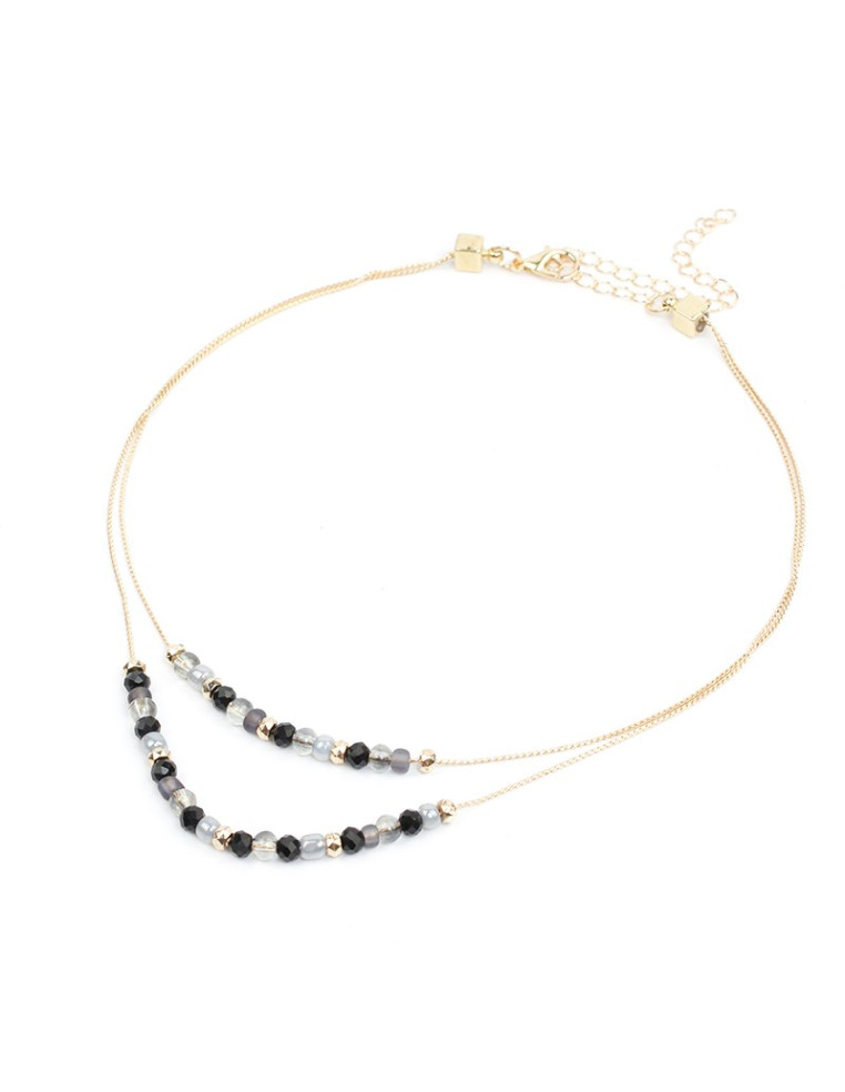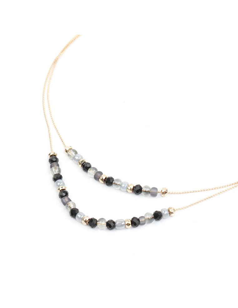 Collar de doble caída de cadenas diferenciadas intervenidas con una combinación de rocas de cristal, mostacillas, bolitas de vidrio y piezas pasantes biseladas de CCB.