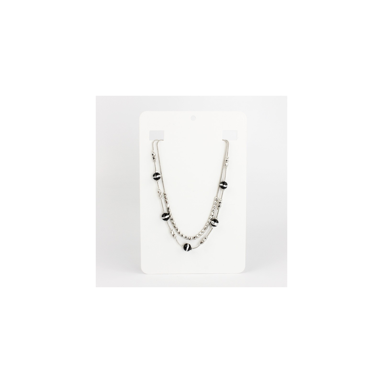 Collar de doble caída de cadenas diferenciadas, una de ellas intervenida con piezas pasantes de CCB, la otra intervenida con bolitas de vidrio especiales, combinadas con piezas de CCB.