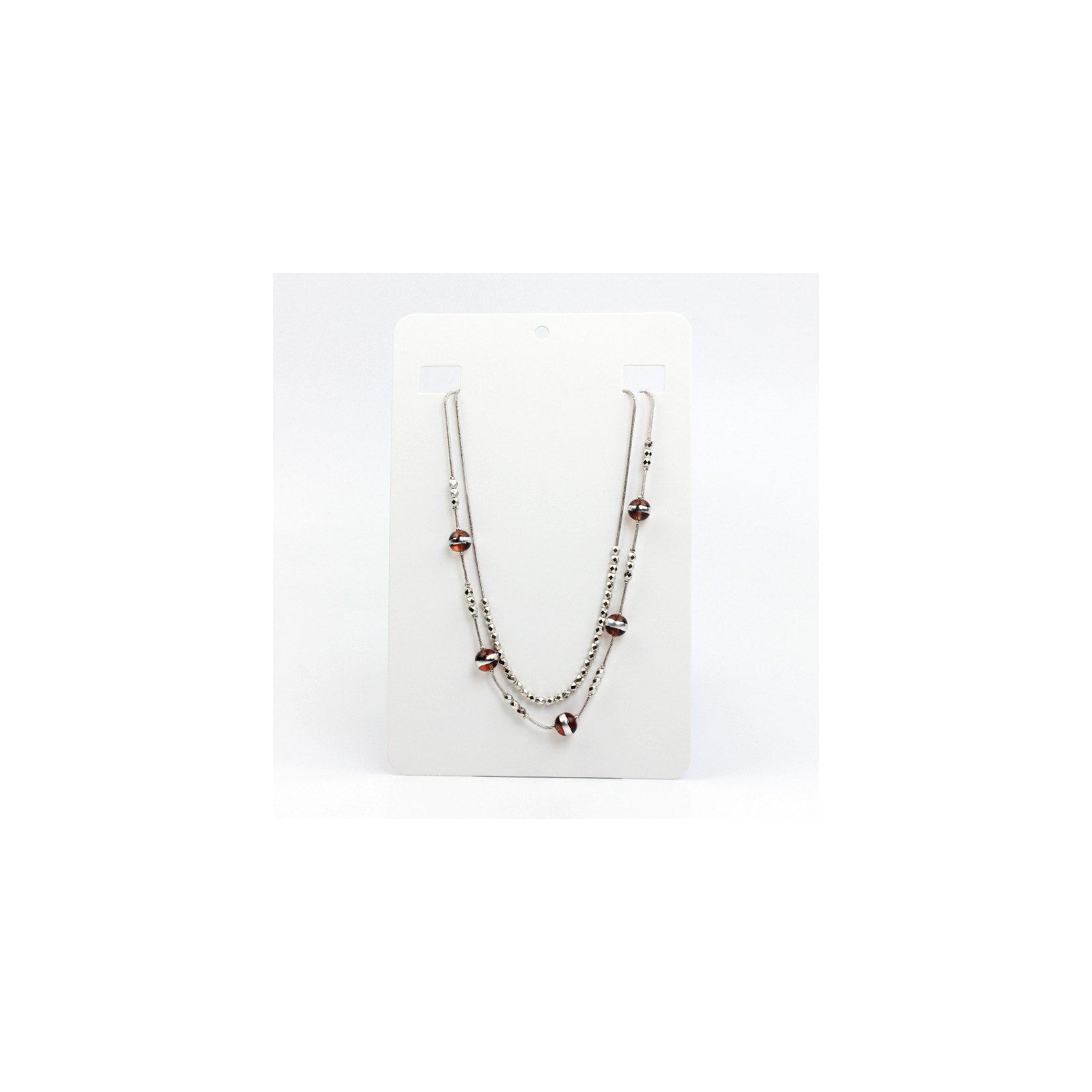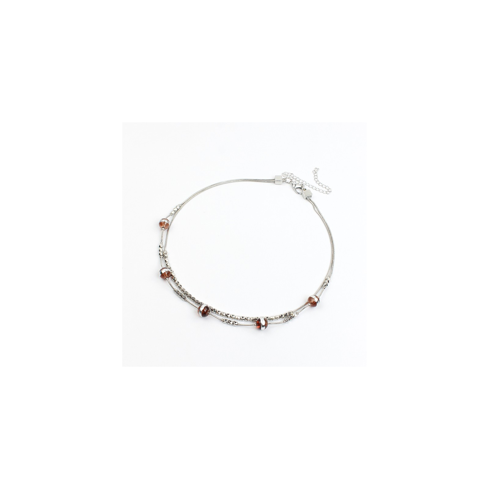 Collar de doble caída de cadenas diferenciadas, una de ellas intervenida con piezas pasantes de CCB, la otra intervenida con bolitas de vidrio especiales, combinadas con piezas de CCB.