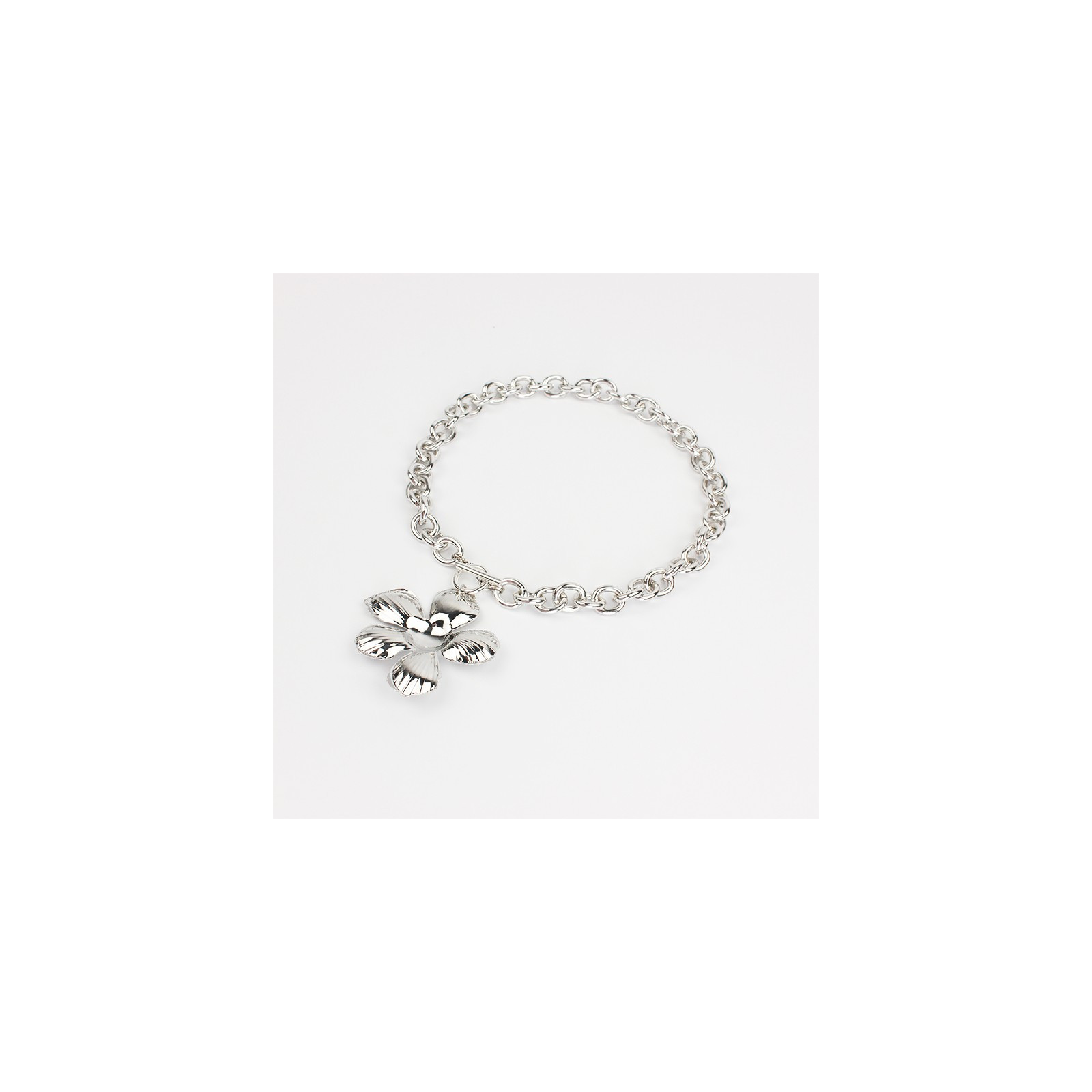 Collar largo de cadena diferenciada exclusiva con dije de chapa níquel en forma de flor y cierre marinero.