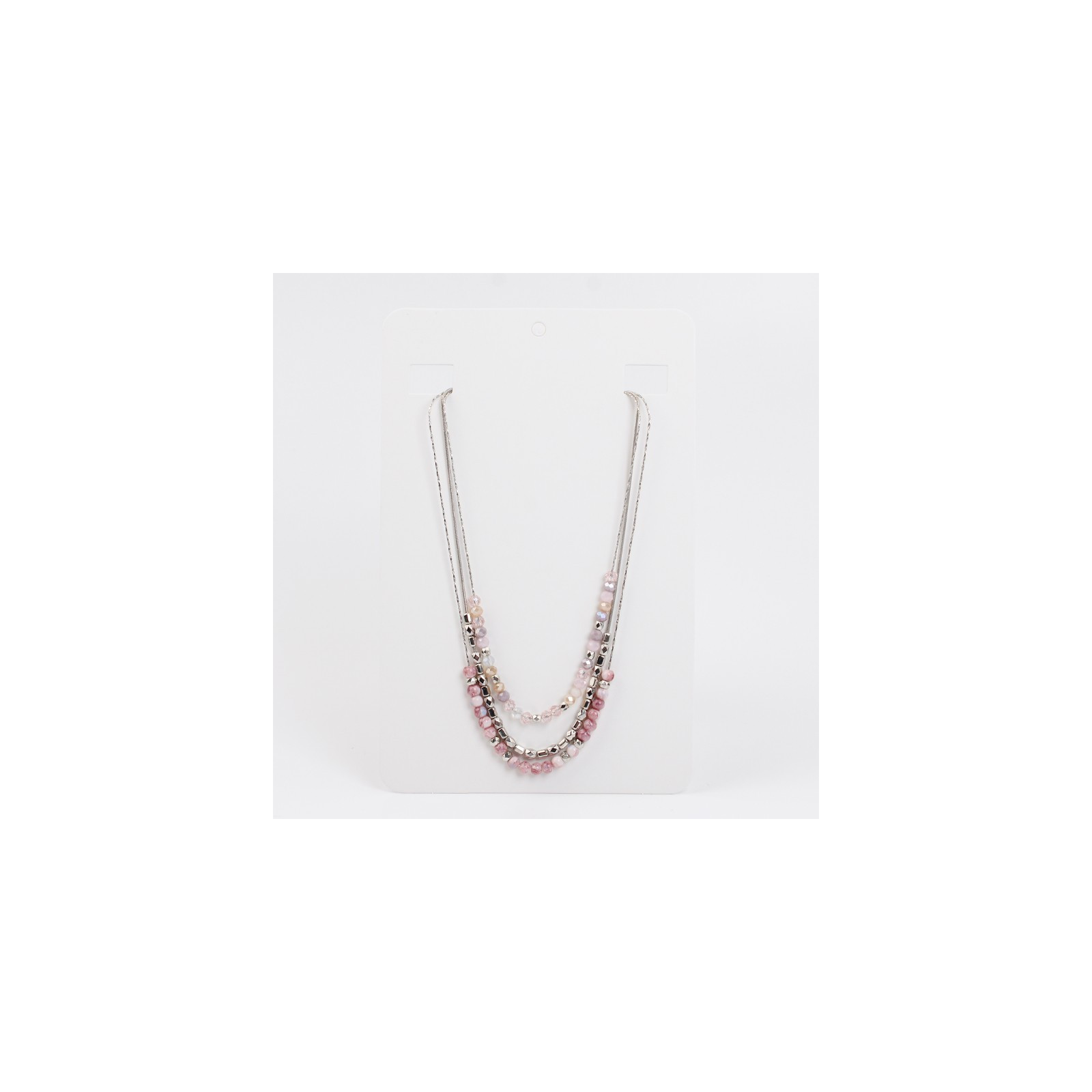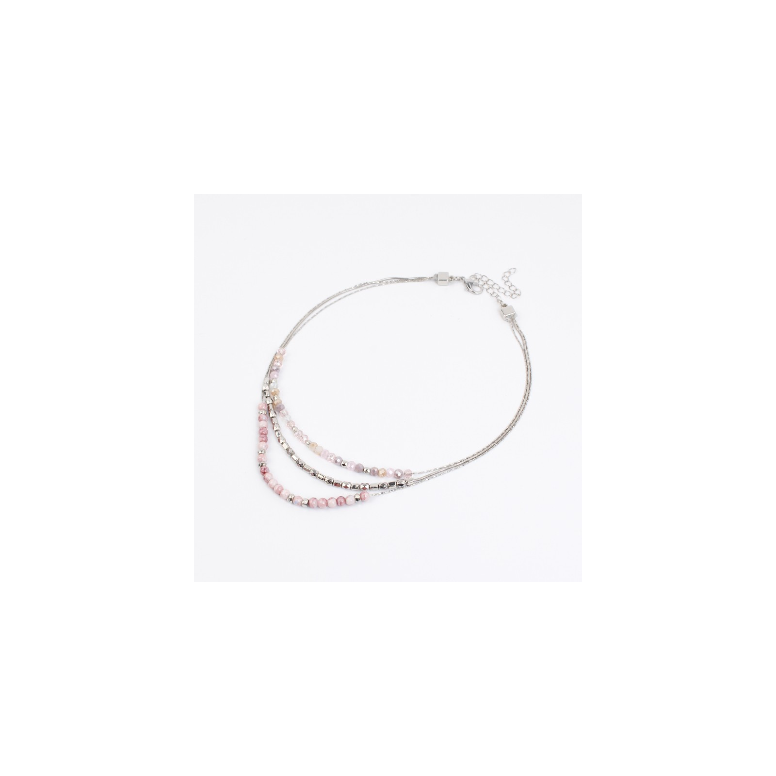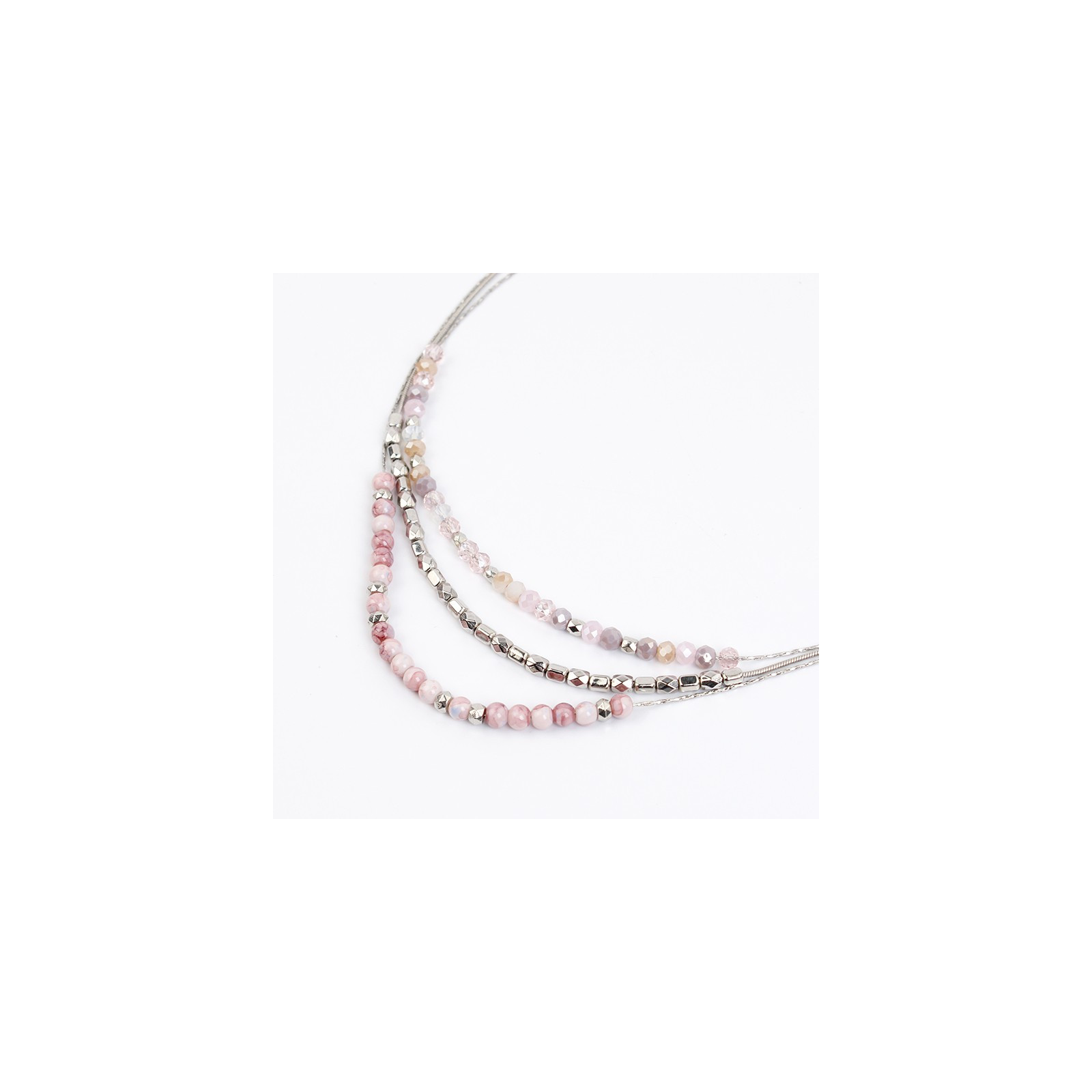 Collar de triple caída de cadenas diferenciadas intervenidas con bolitas de vidrio, rocas de cristal y piezas pasantes de CCB.