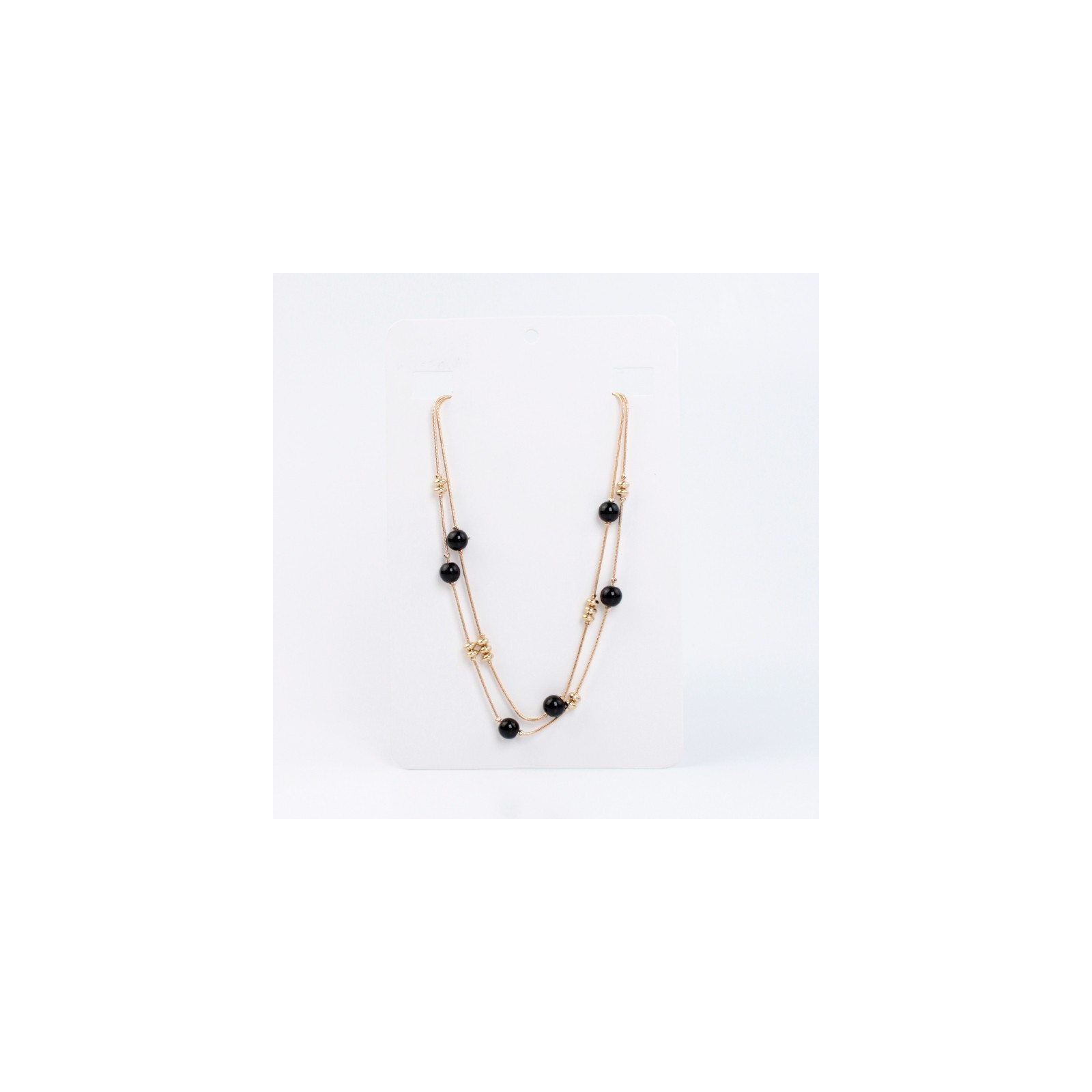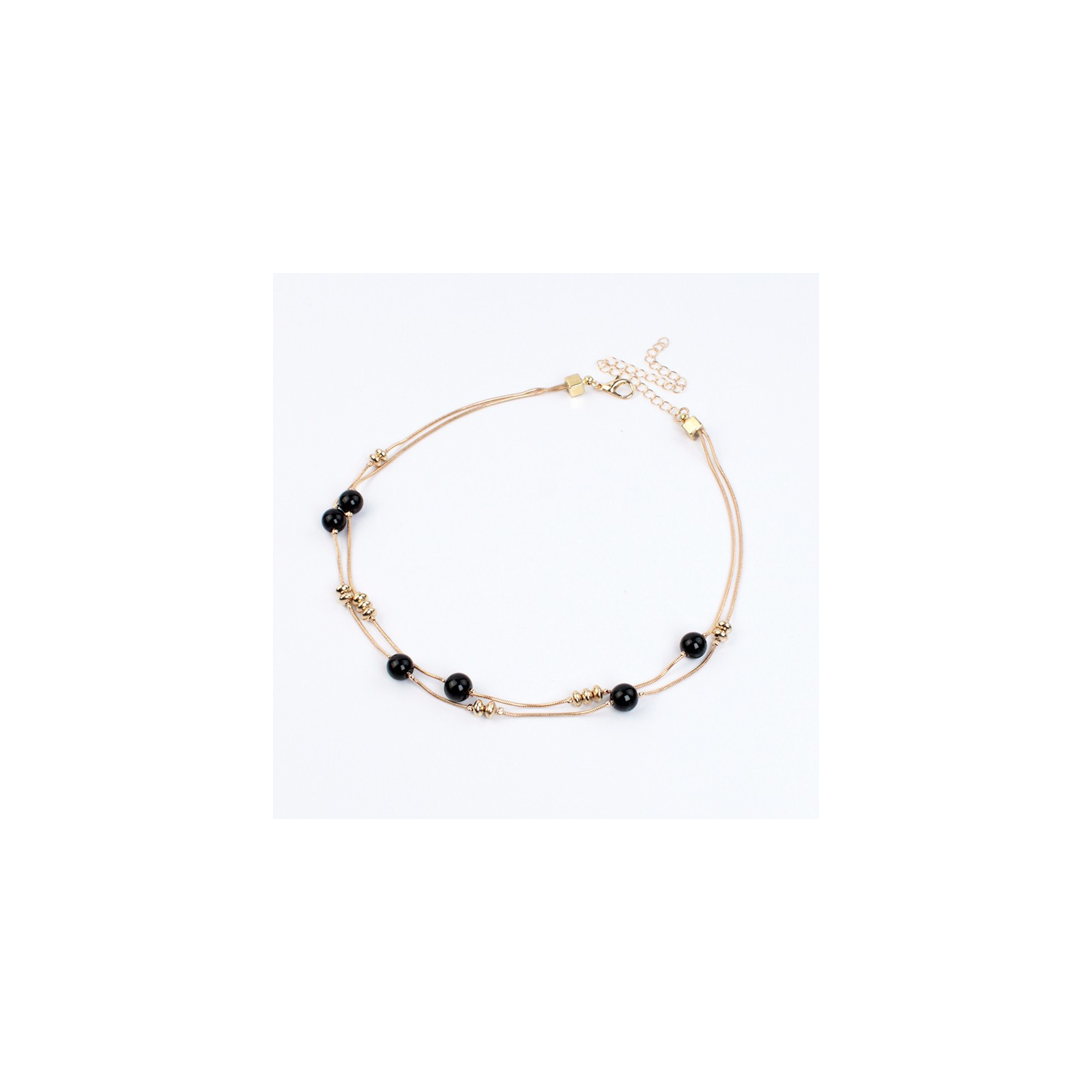 Collar de doble caída de cadenas diferenciadas, enhebradas con bolitas de vidrio craqueladas y piezas pasantes de CCB dorado.