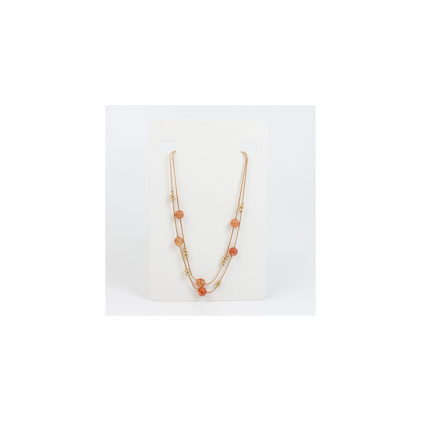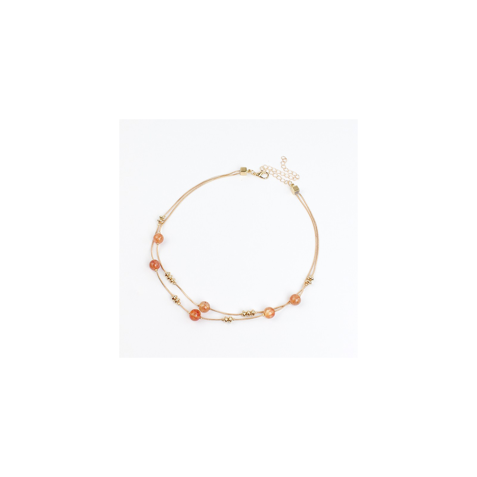 Collar de doble caída de cadenas diferenciadas, enhebradas con bolitas de vidrio craqueladas y piezas pasantes de CCB dorado.
