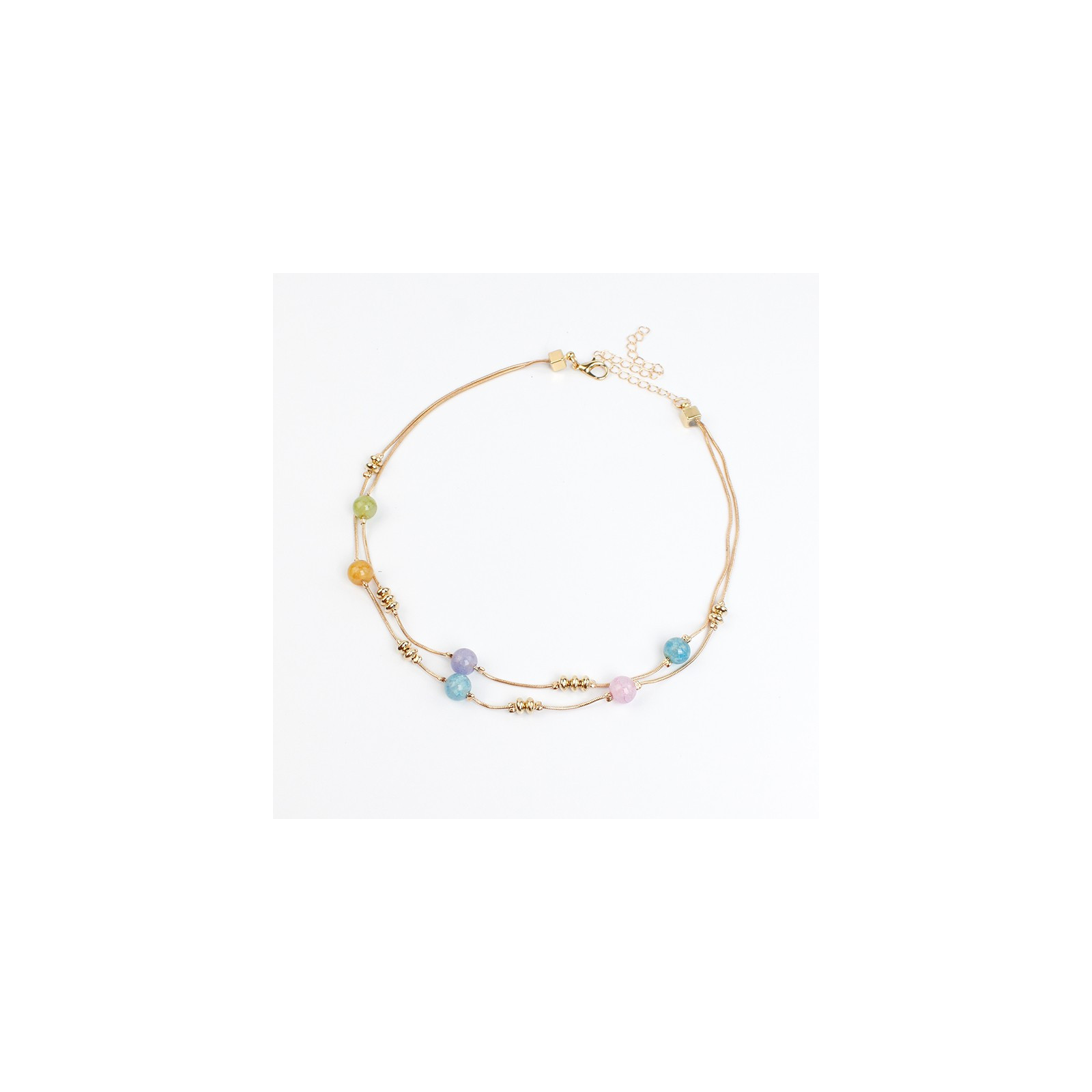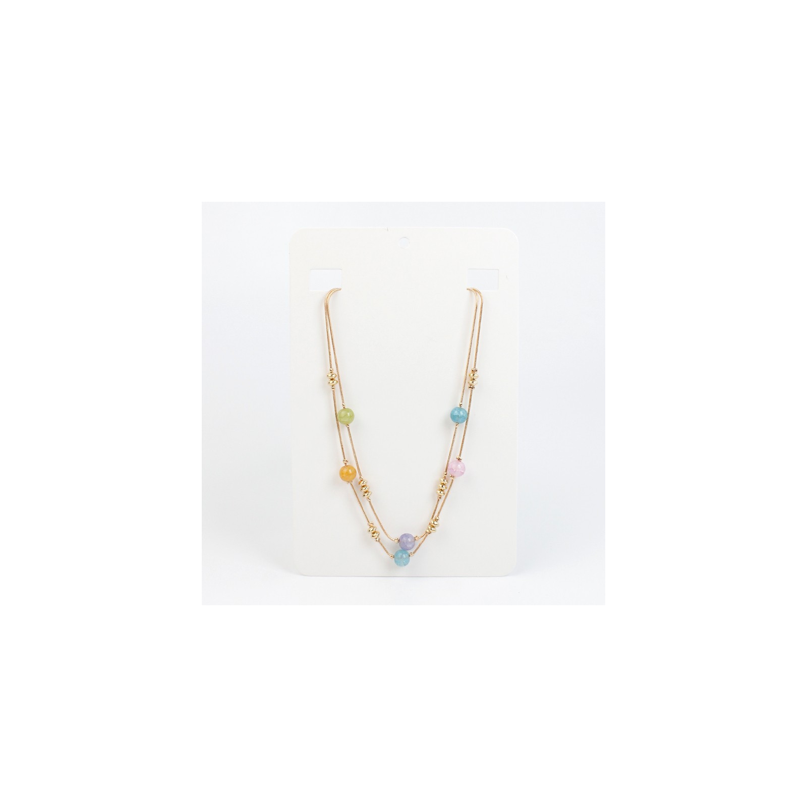 Collar de doble caída de cadenas diferenciadas, enhebradas con bolitas de vidrio craqueladas y piezas pasantes de CCB dorado.