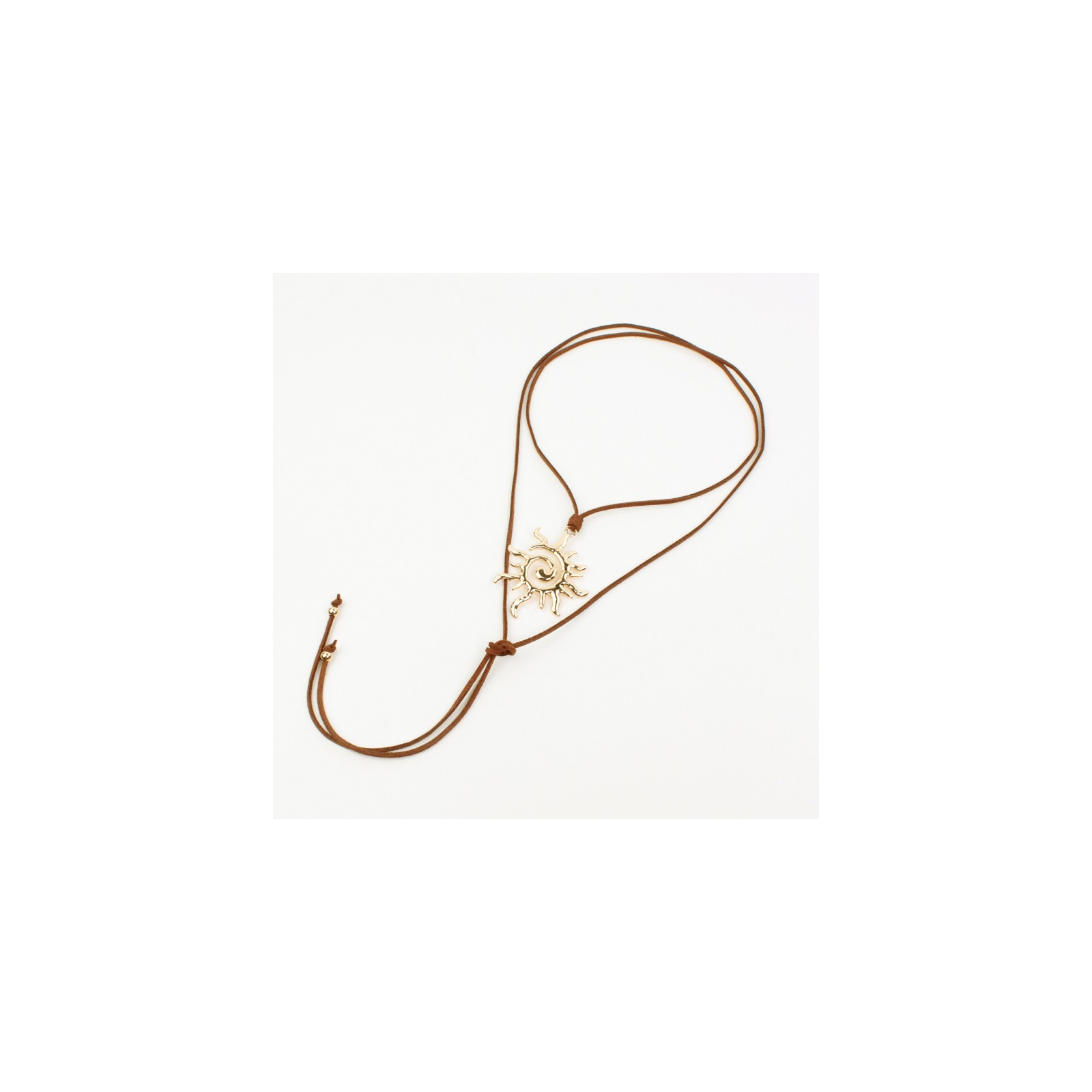 Collar de gamuza de múltiples vueltas, con dije exclusivo de fundición con forma sol playero y terminales en punteras.