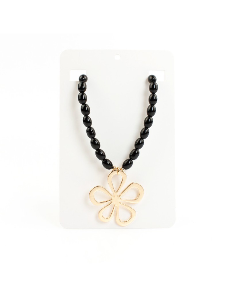 Collar flexible de lenga enhebrada con bolitas de vidrio cónicas diferenciadas, y dije exclusivo de fundición con forma de flor.