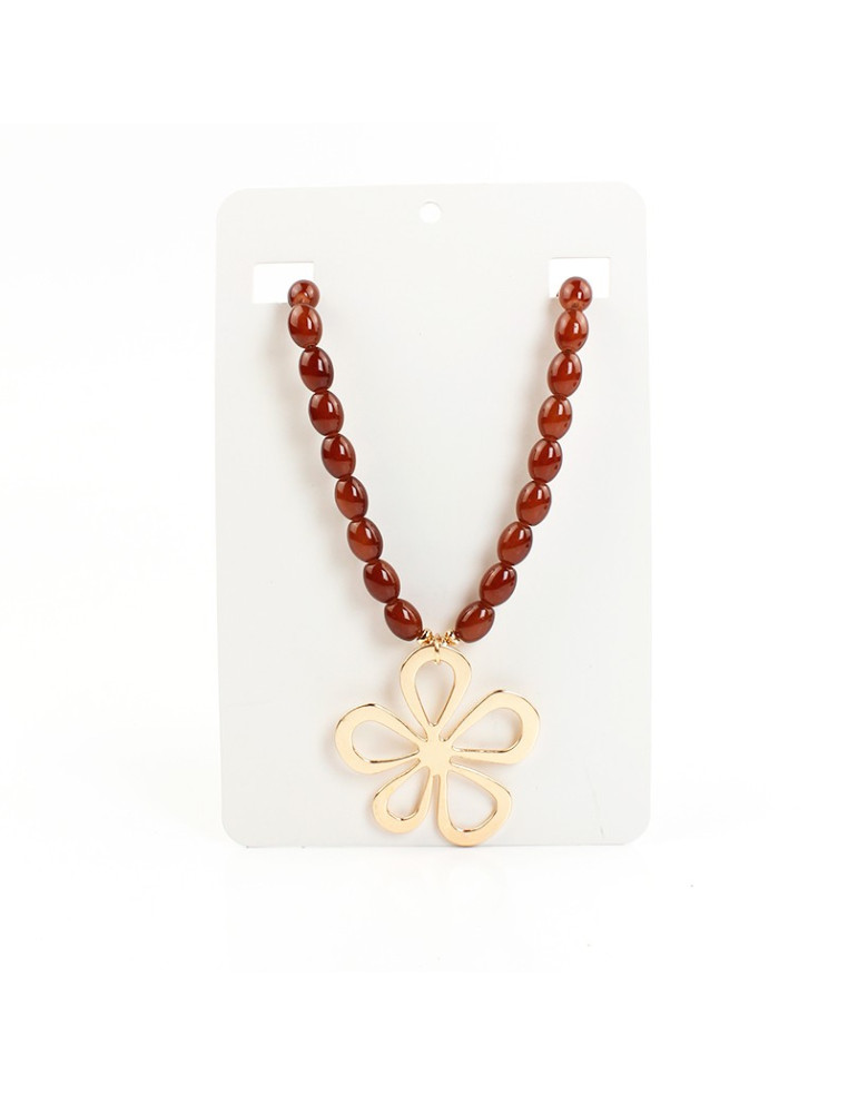 Collar flexible de lenga enhebrada con bolitas de vidrio cónicas diferenciadas, y dije exclusivo de fundición con forma de flor.