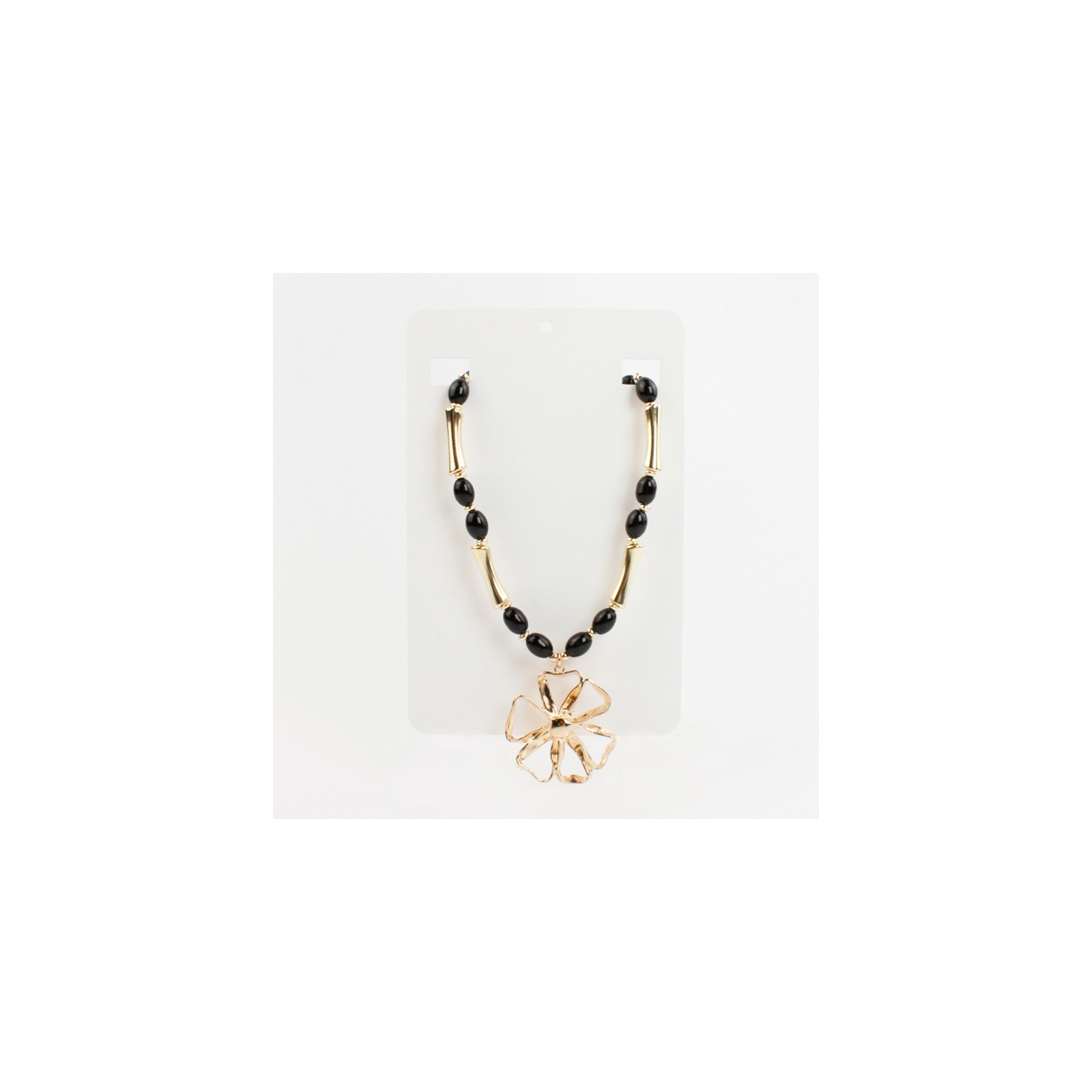 Collar flexible de lenga enhebrado con piezas de vidrio diferenciadas, combinadas con piezas pasantes de CCB y dije exclusivo de fundición con forma de flor.