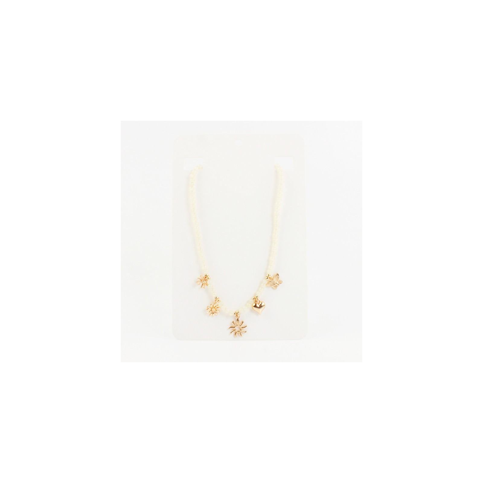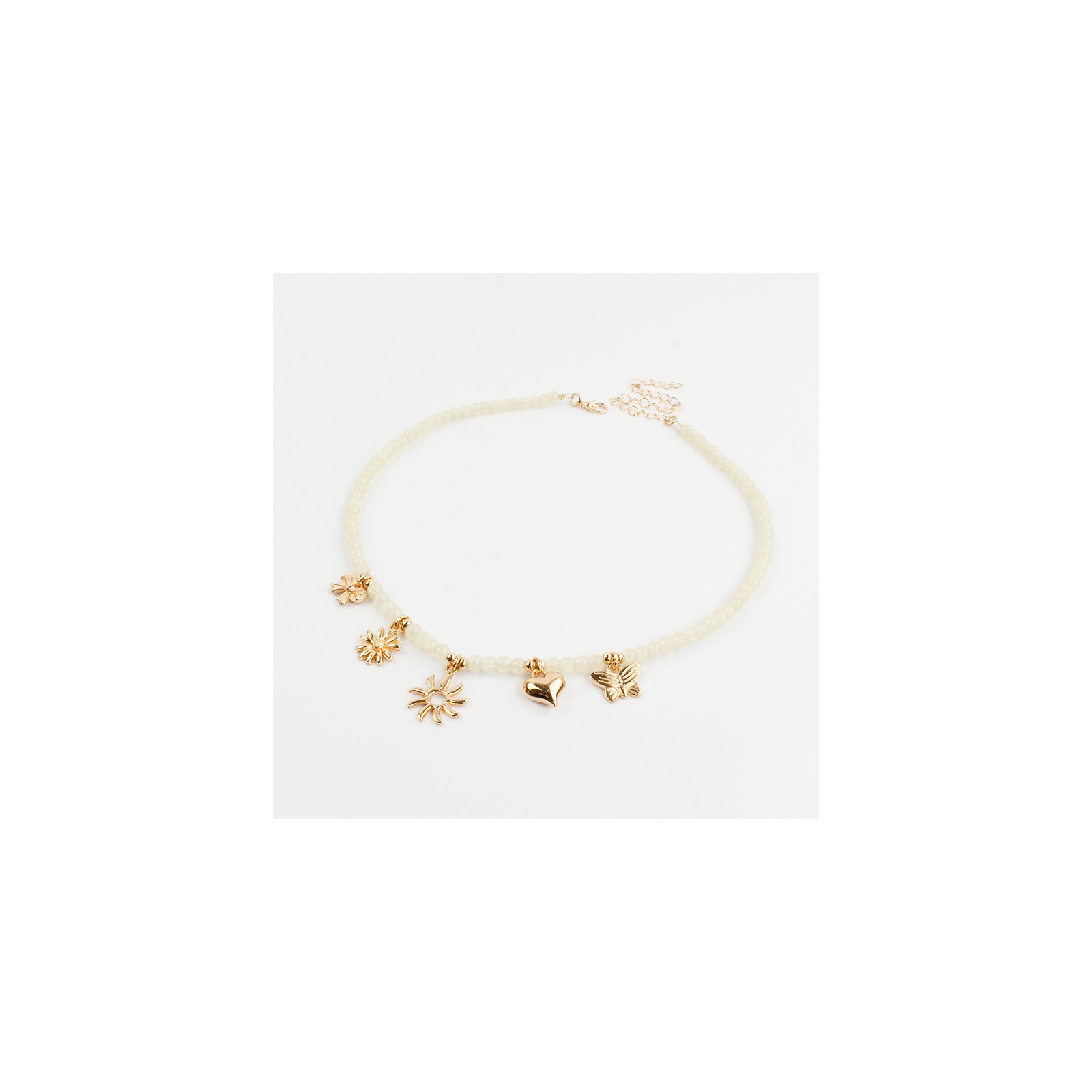 Collar flexible de lenga enhebrada con bolitas de vidrio diferenciadas con múltiples dijes primaverales de fundición.