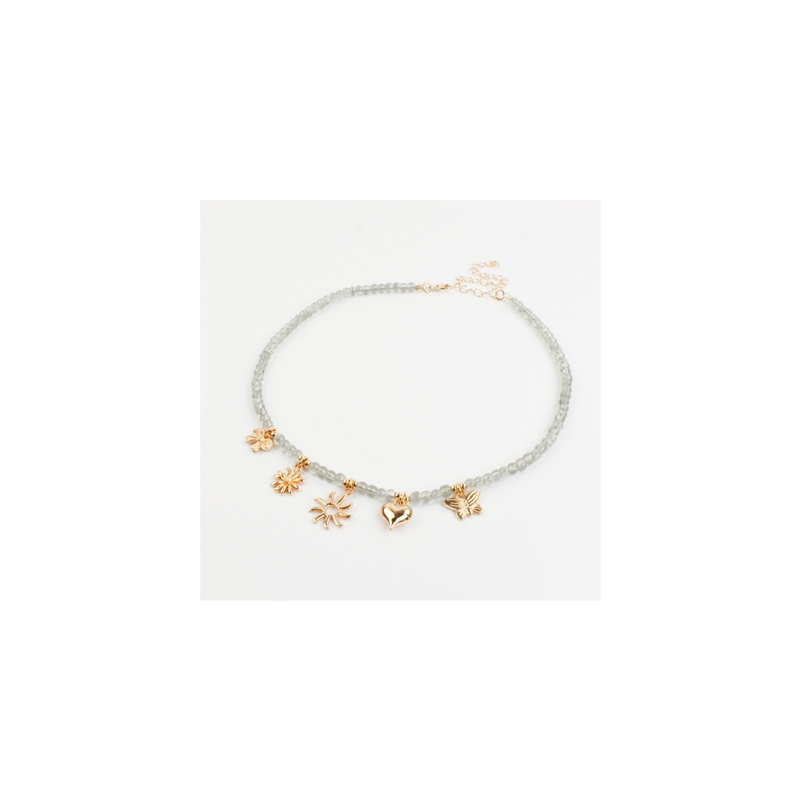 Collar flexible de lenga enhebrada con bolitas de vidrio diferenciadas con múltiples dijes primaverales de fundición.