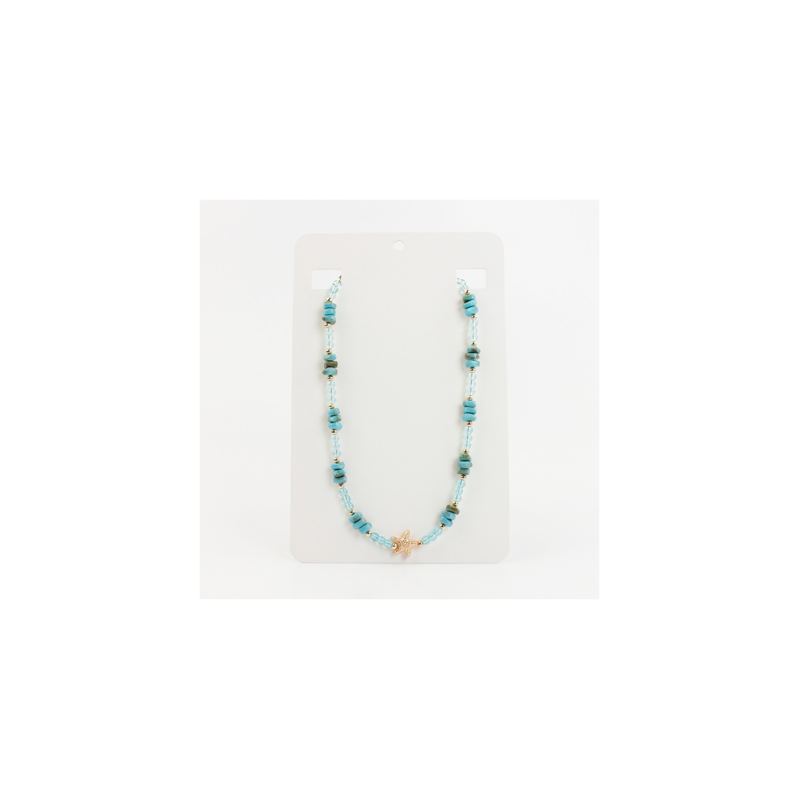 Collar flexible de lenga enhebrada con bolitas de vidrio diferenciadas, combinadas con escallas de acrílico, bolitas de CCB y dije exclusivo de fundición con forma de estrella de mar.