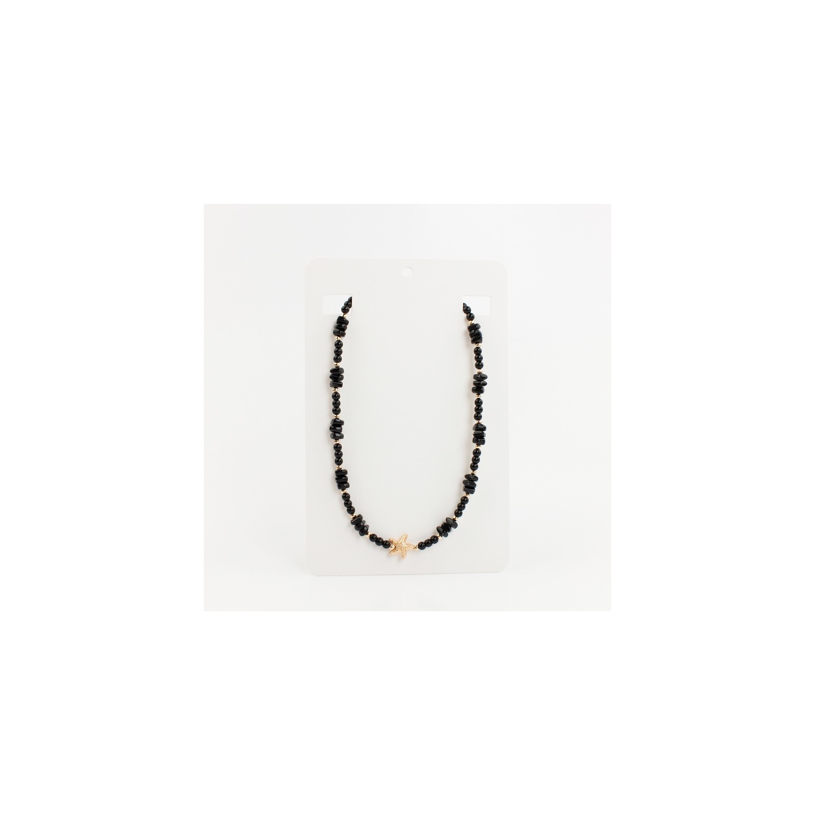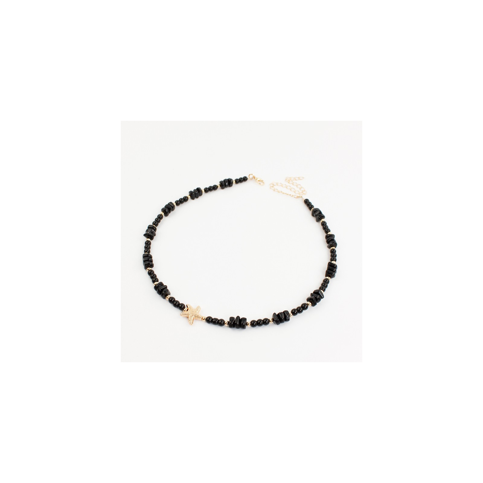 Collar flexible de lenga enhebrada con bolitas de vidrio diferenciadas, combinadas con escallas de acrílico, bolitas de CCB y dije exclusivo de fundición con forma de estrella de mar.