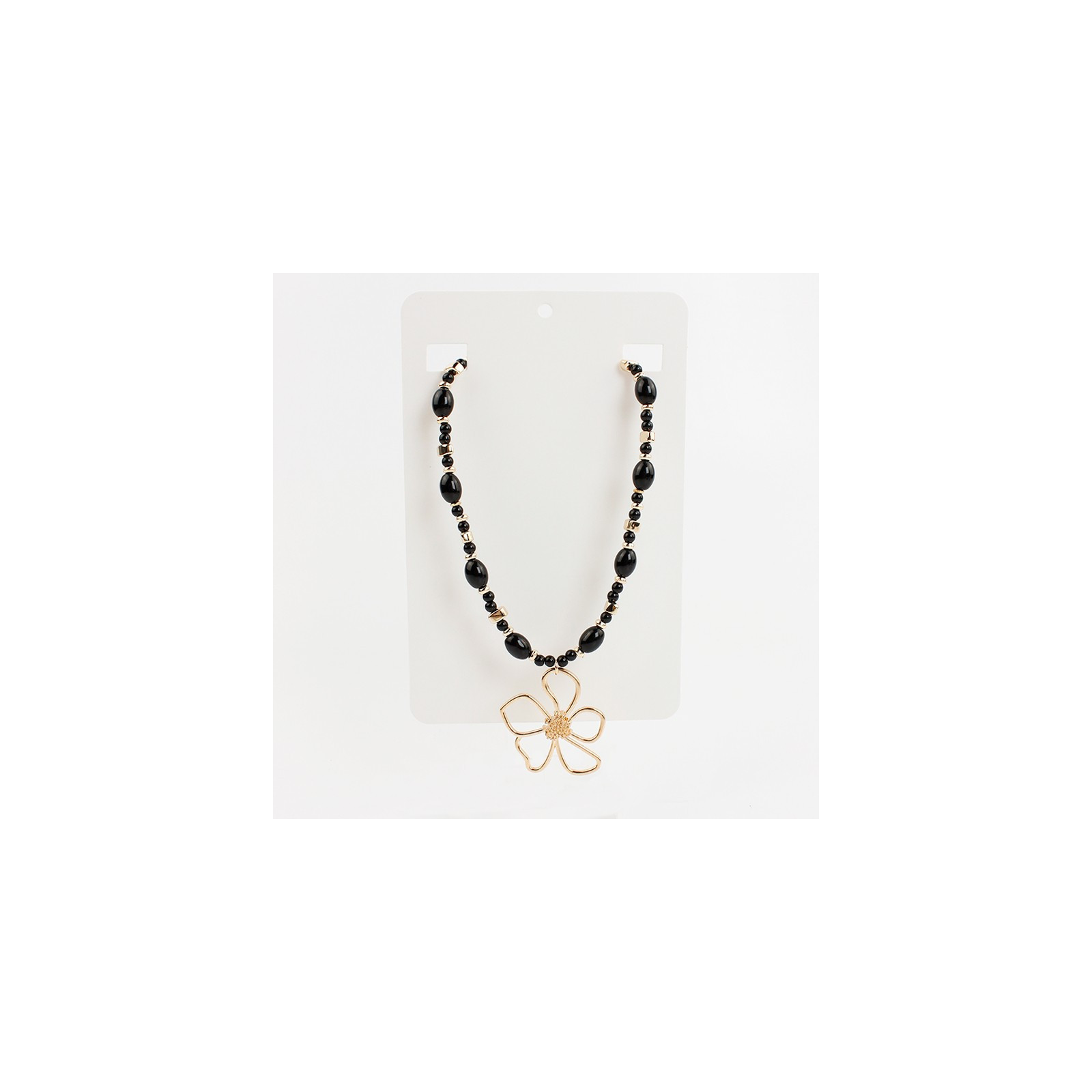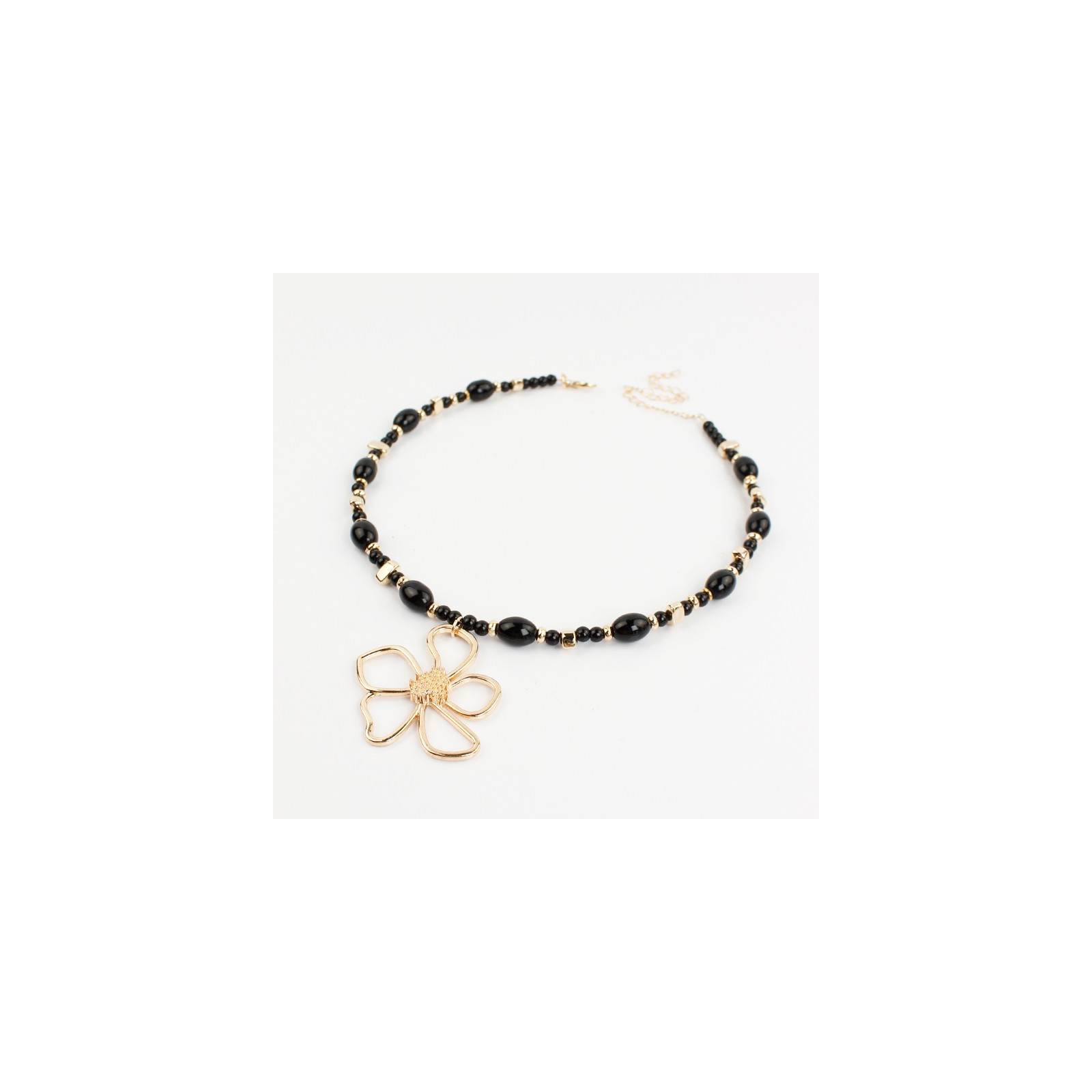 Collar flexible de lenga enhebrada con piezas de vidrio exclusivas, combinadas con bolitas de vidrio, piezas pasantes de CCB y dije exclusivo de fundición con forma de flor.