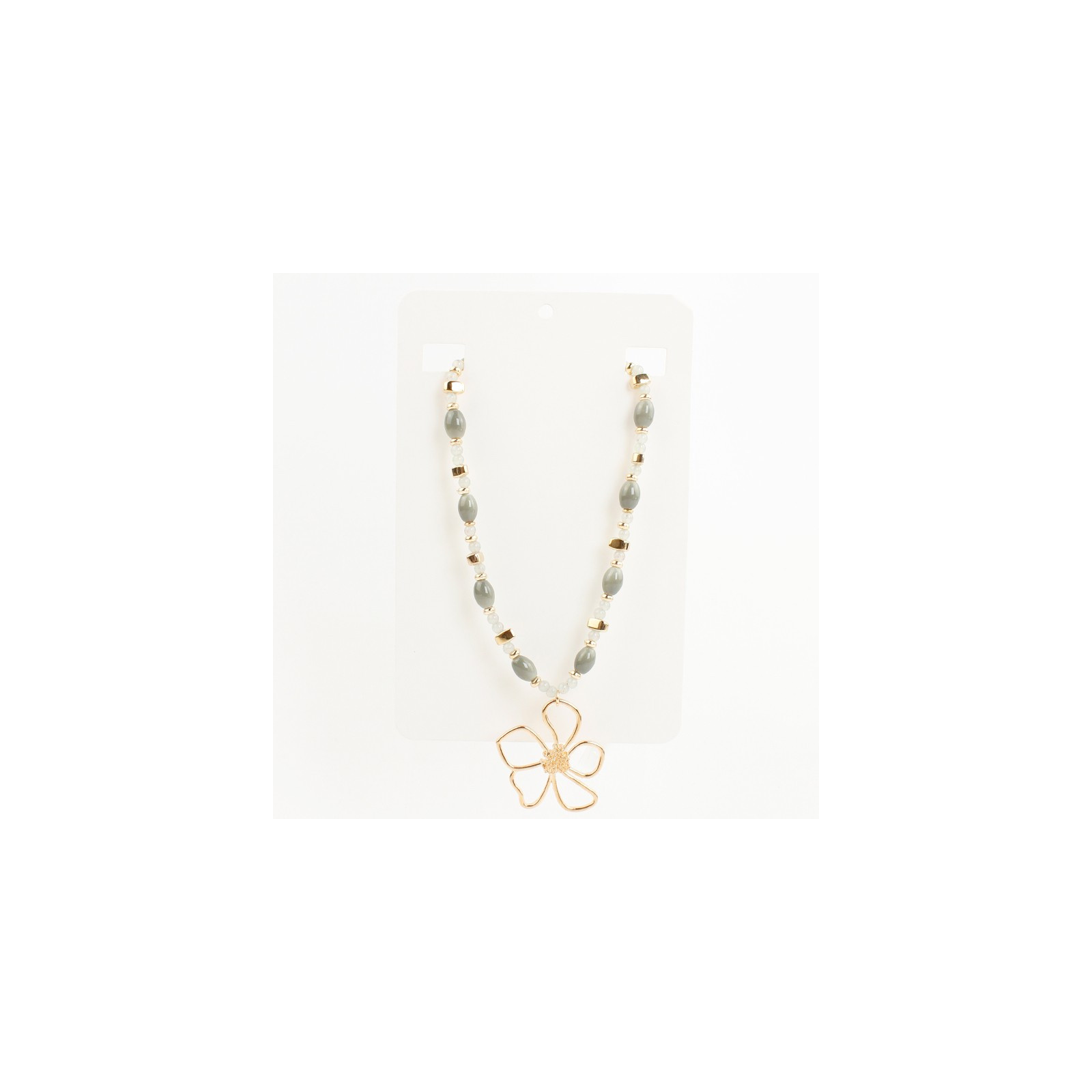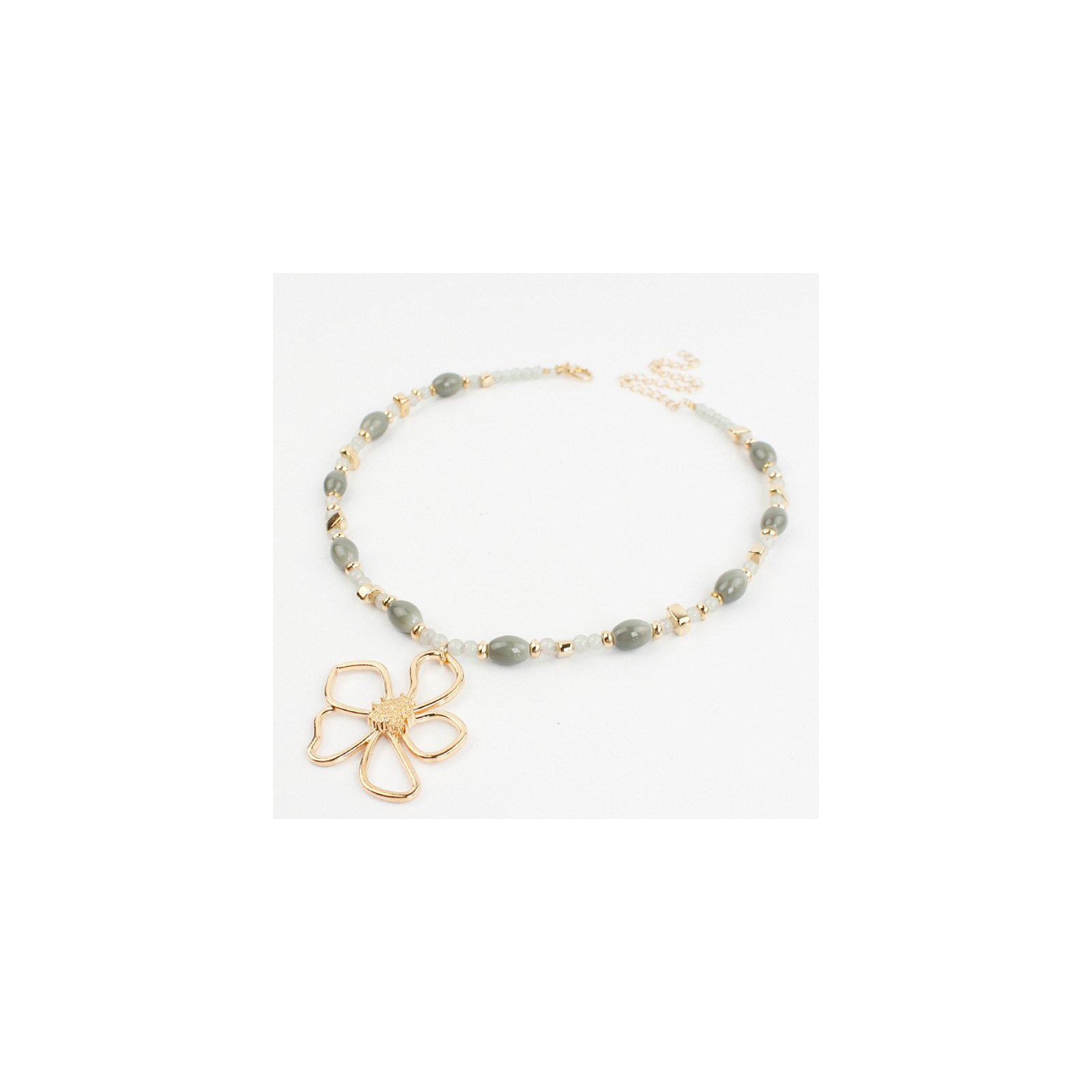 Collar flexible de lenga enhebrada con piezas de vidrio exclusivas, combinadas con bolitas de vidrio, piezas pasantes de CCB y dije exclusivo de fundición con forma de flor.