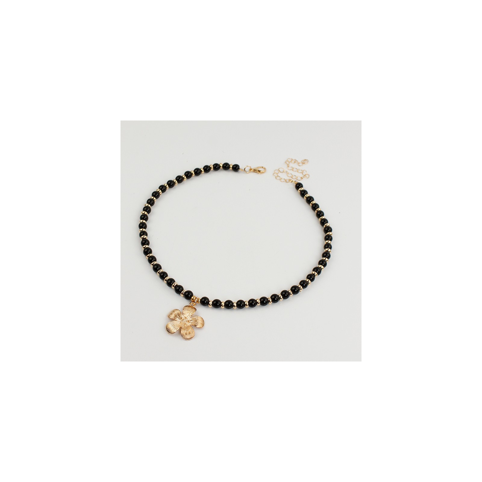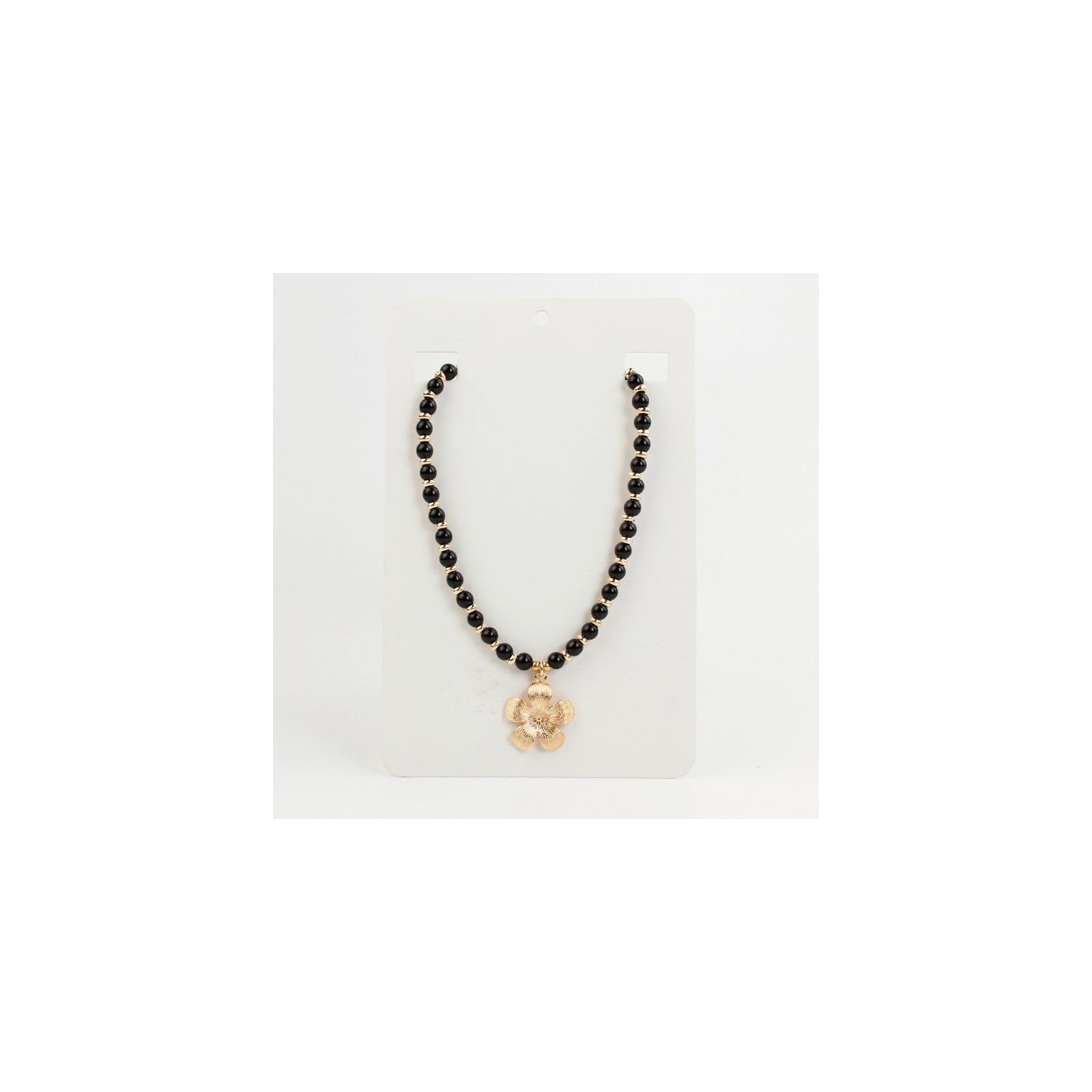 Collar flexible de lenga enhebrada con bolitas de vidrio diferenciadas, combinadas con piezas separadoras de CCB y dije exclusivo de fundición.