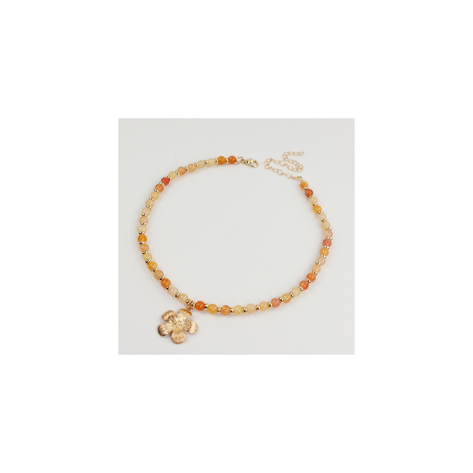 Collar flexible de lenga enhebrada con bolitas de vidrio diferenciadas, combinadas con piezas separadoras de CCB y dije exclusivo de fundición.