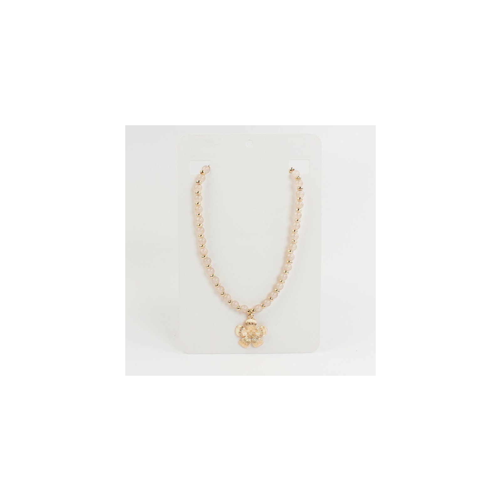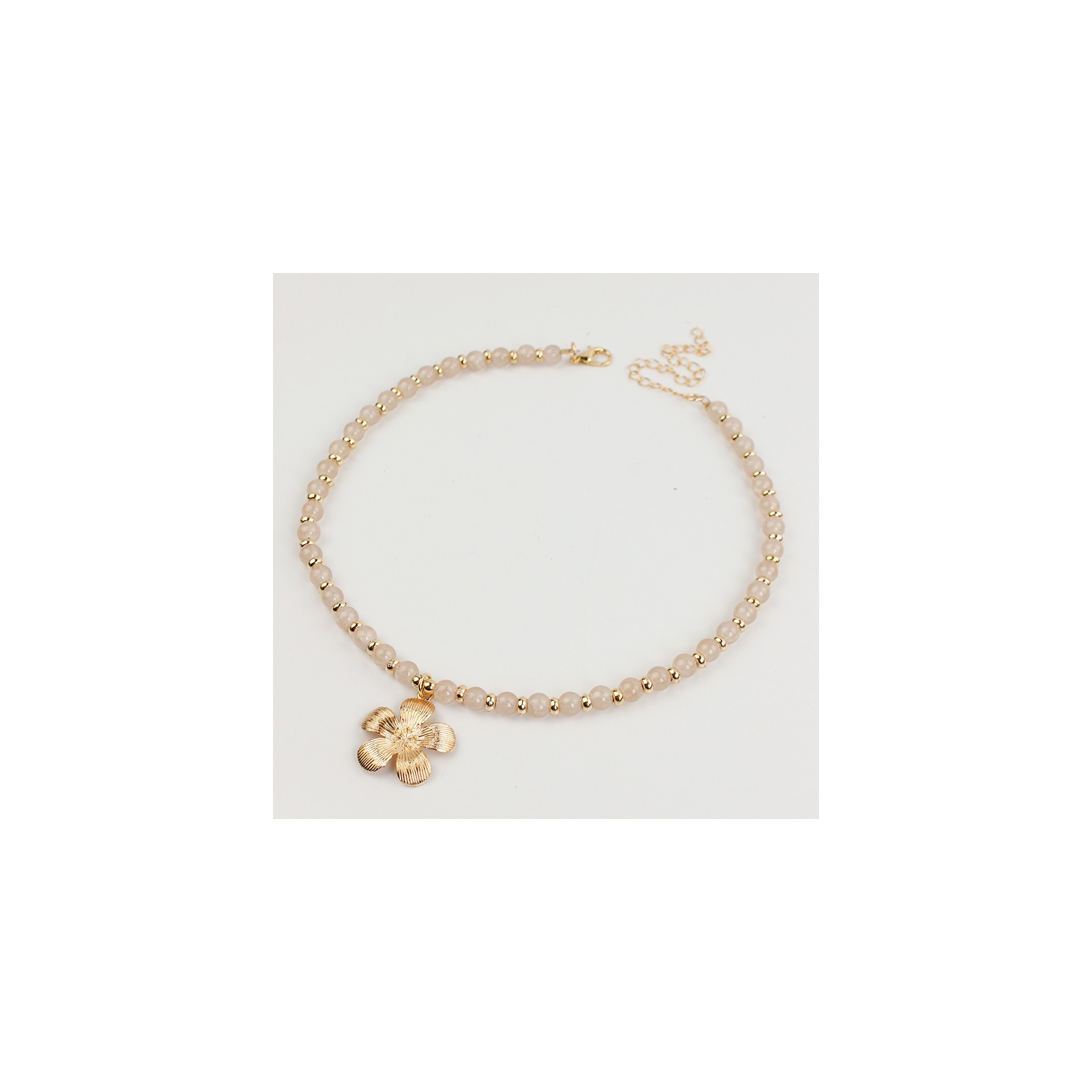 Collar flexible de lenga enhebrada con bolitas de vidrio diferenciadas, combinadas con piezas separadoras de CCB y dije exclusivo de fundición.