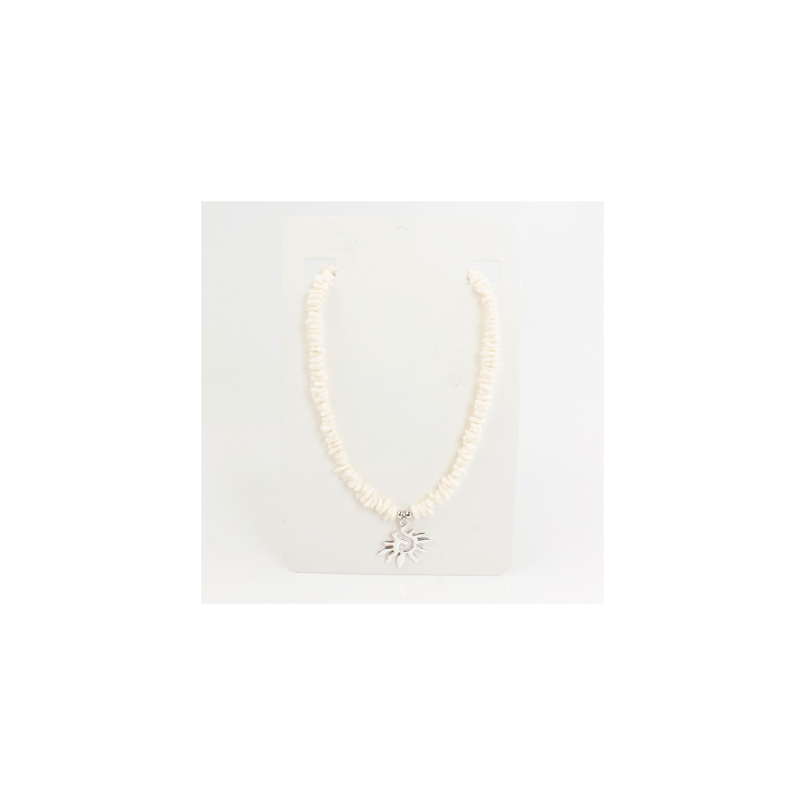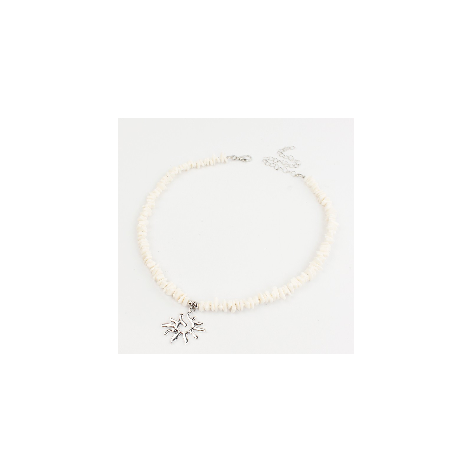 Collar flexible de lenga enhebrado con escallas de acrílico y dije exclusivo de fundición con forma de sol.