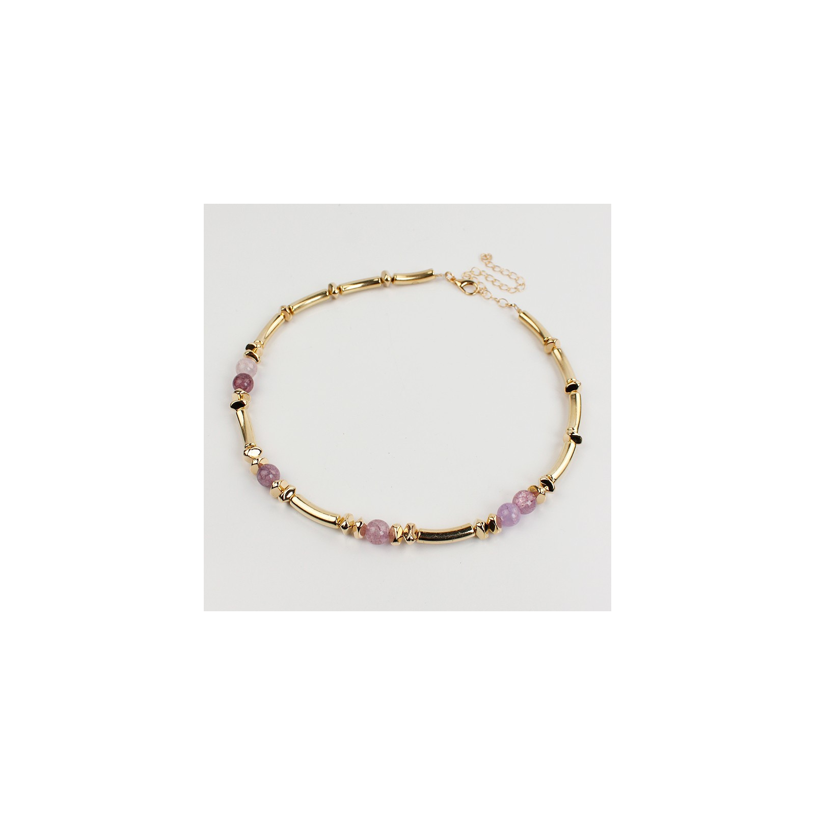 Collar flexible de lenga enhebrado con bolitas de vidrio diferenciadas, combinadas con piezas pasantes de CCB dorado.