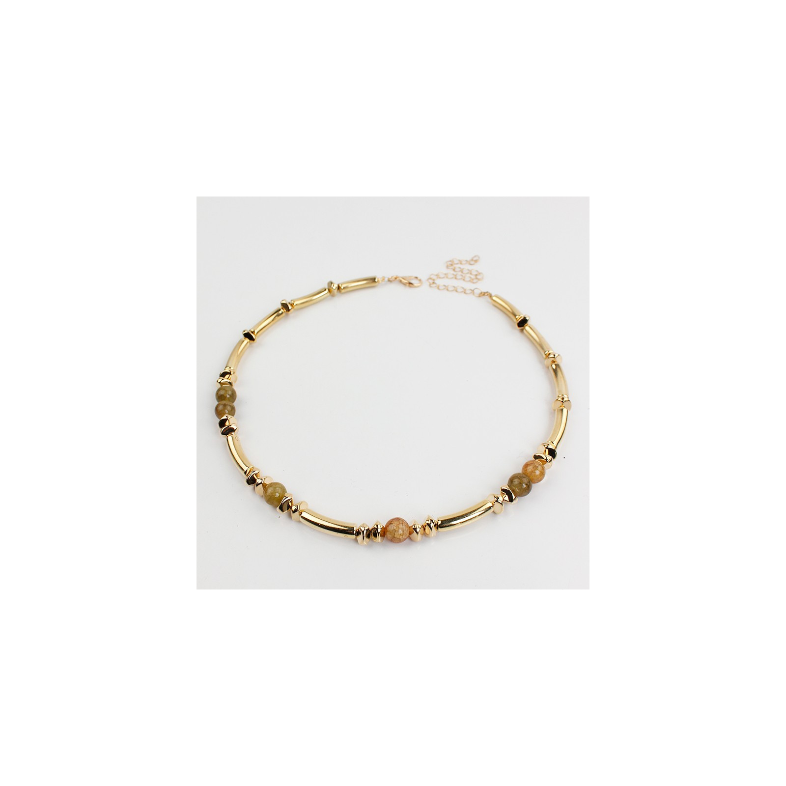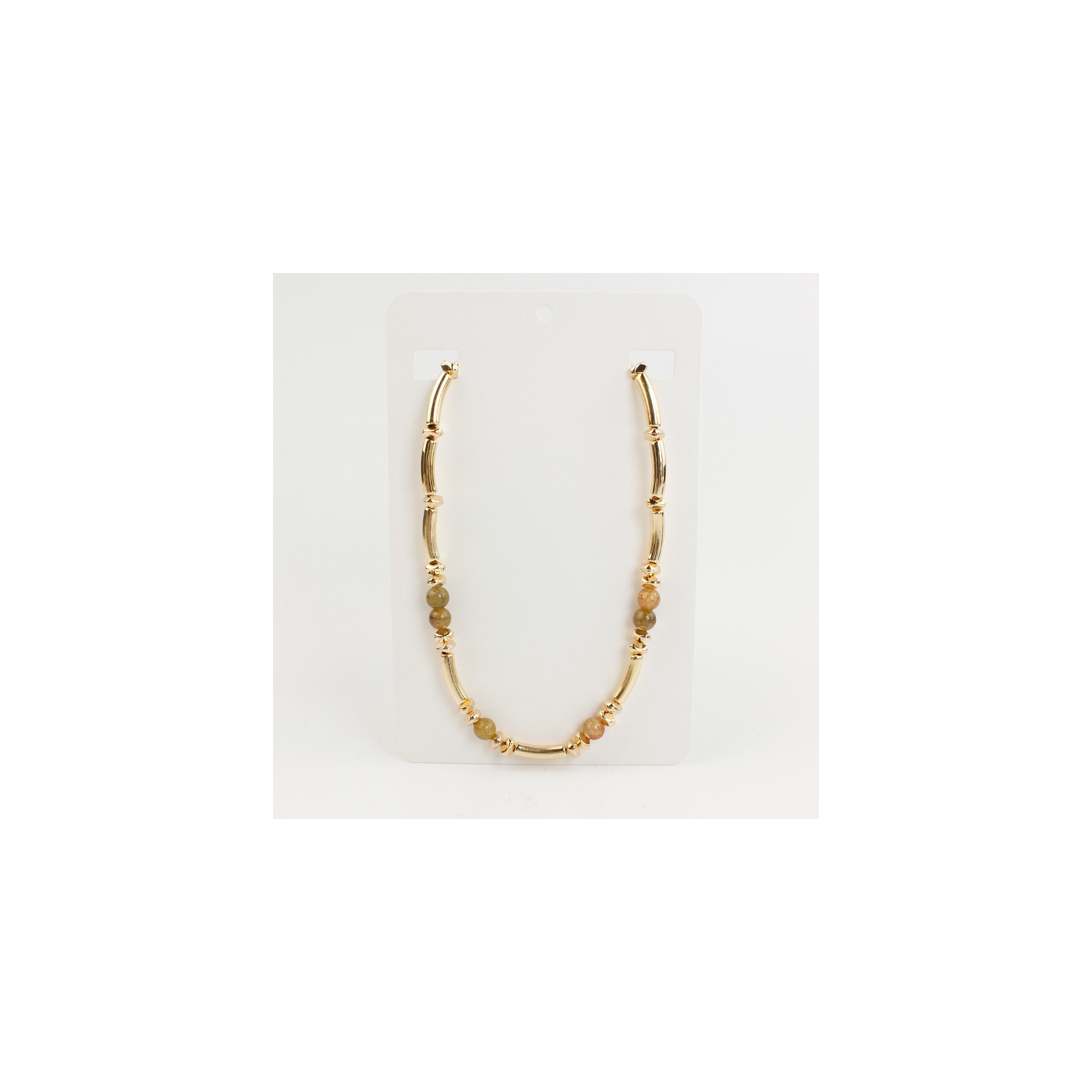 Collar flexible de lenga enhebrado con bolitas de vidrio diferenciadas, combinadas con piezas pasantes de CCB dorado.