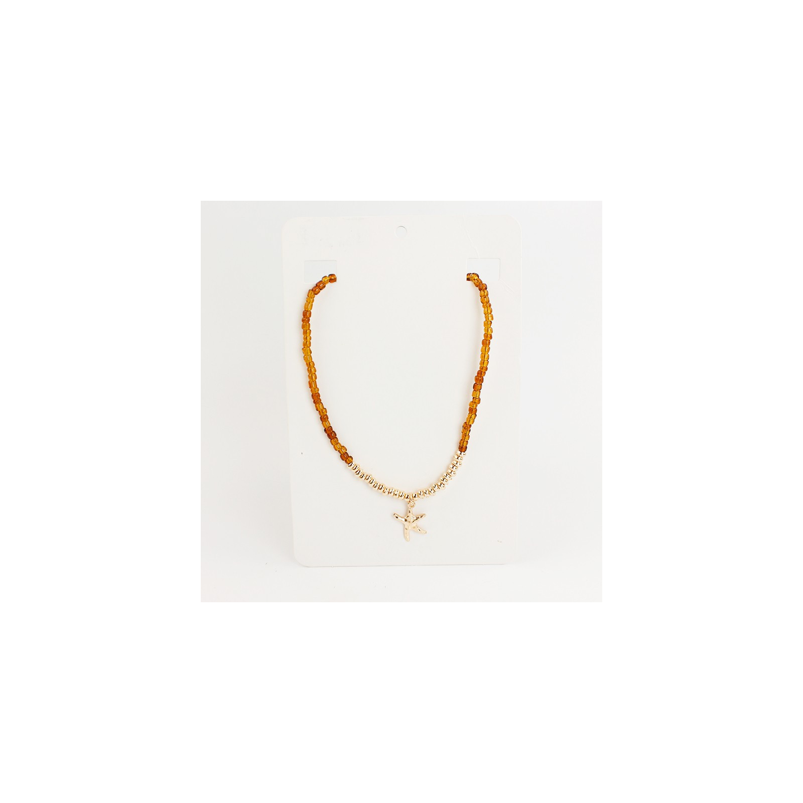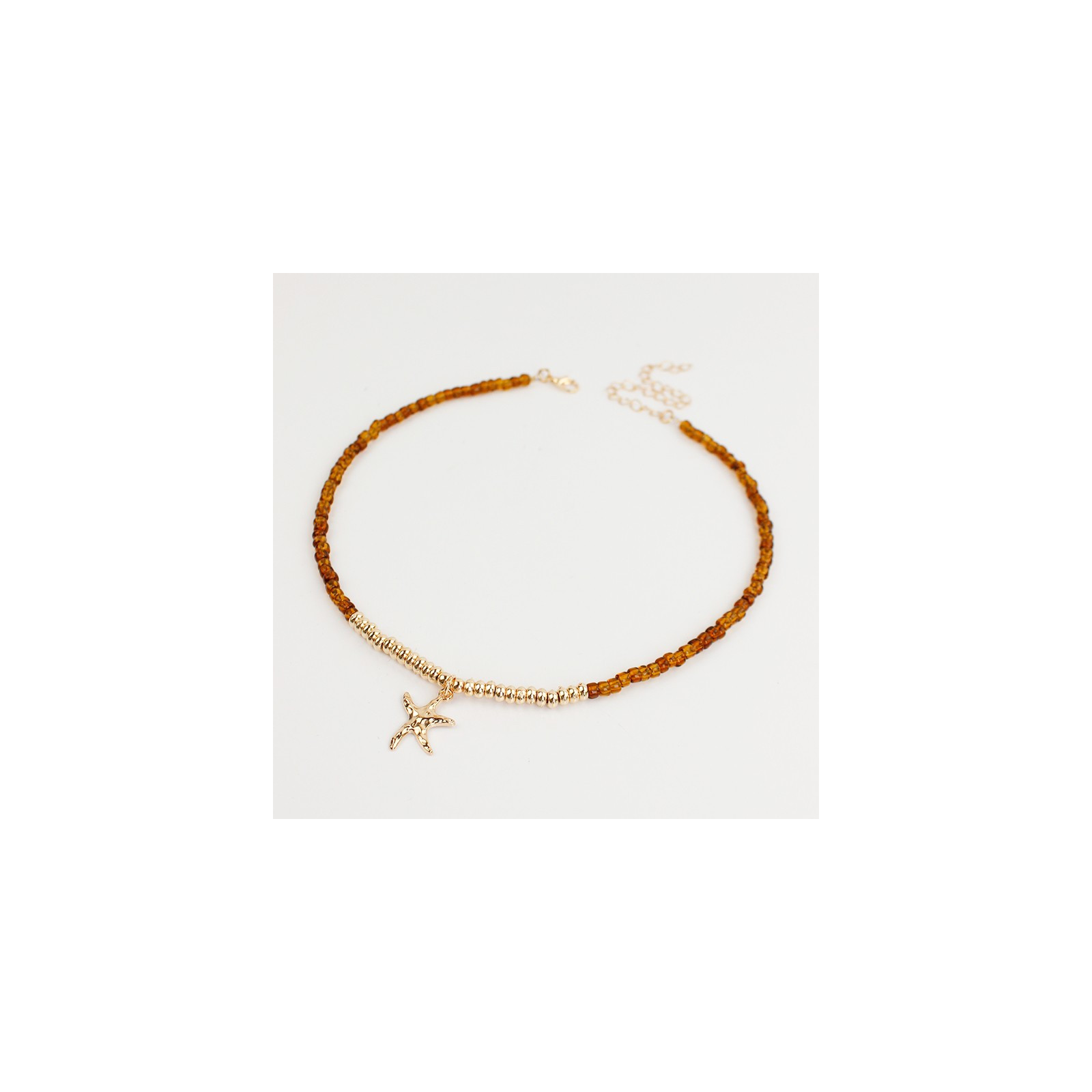 Collar flexible de lenga enhebrada con mostacillas, piezas pasantes de CCB dorado y dije exclusivo con forma de estrella de mar.