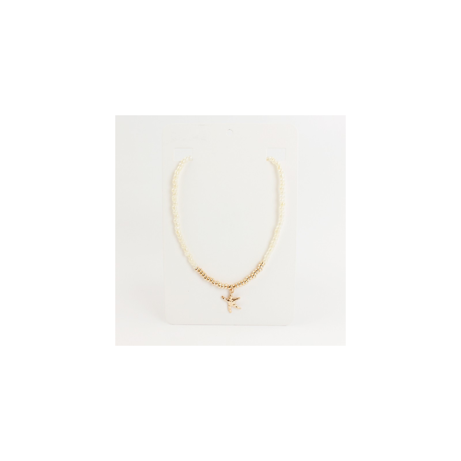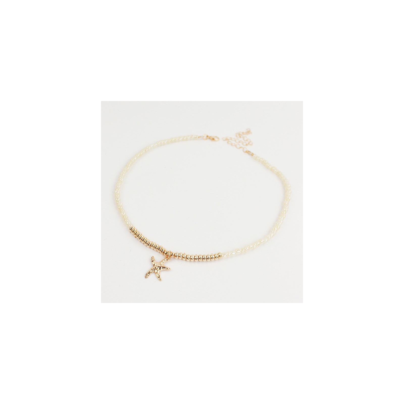 Collar flexible de lenga enhebrada con mostacillas, piezas pasantes de CCB dorado y dije exclusivo con forma de estrella de mar.