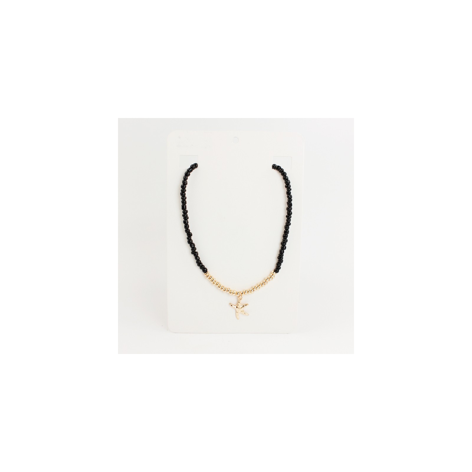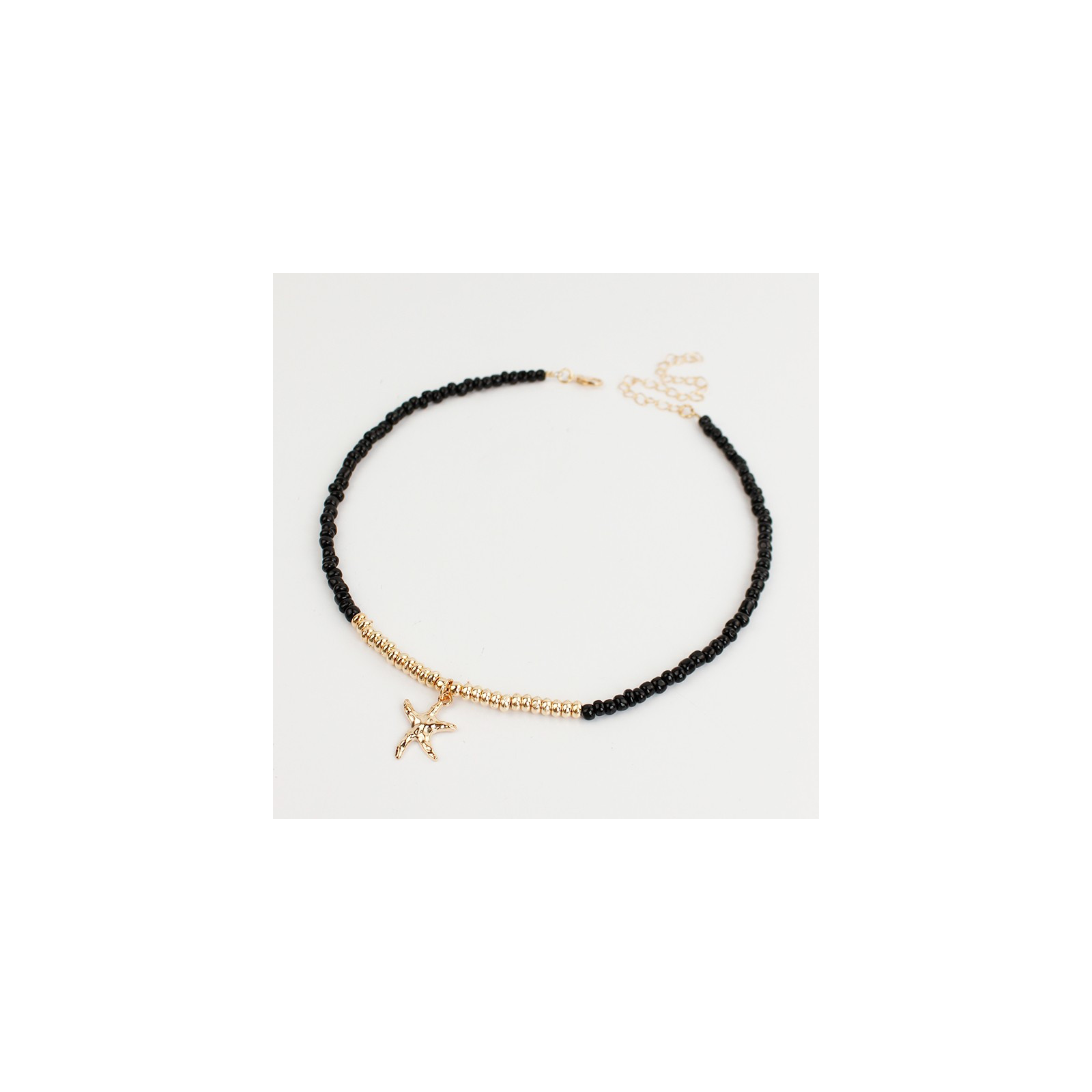 Collar flexible de lenga enhebrada con mostacillas, piezas pasantes de CCB dorado y dije exclusivo con forma de estrella de mar.