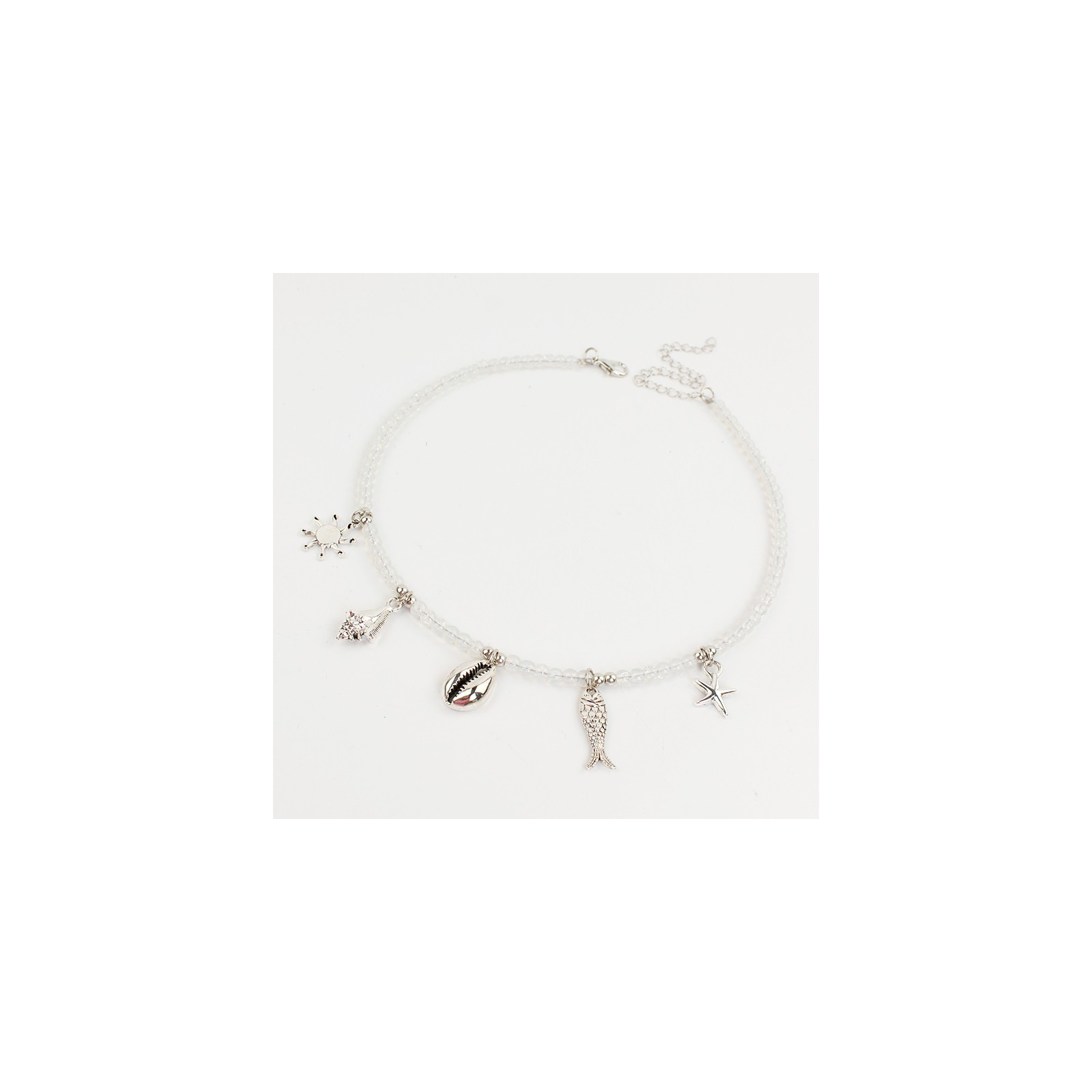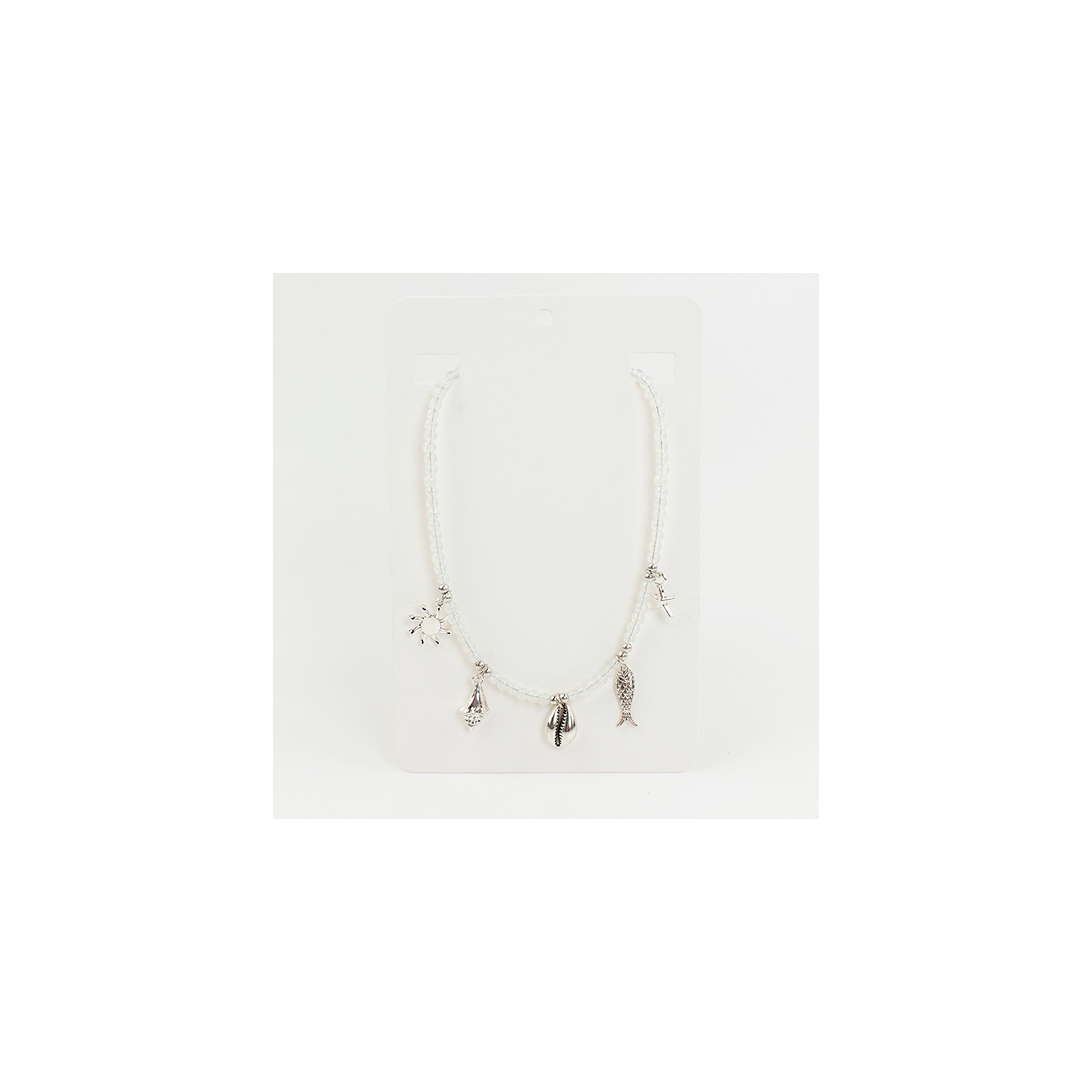 Collar flexible de lenga enhebrada con bolitas de vidrio diferenciadas, combinadas con múltiples dijes de fundición de distintas formas y tamaños.