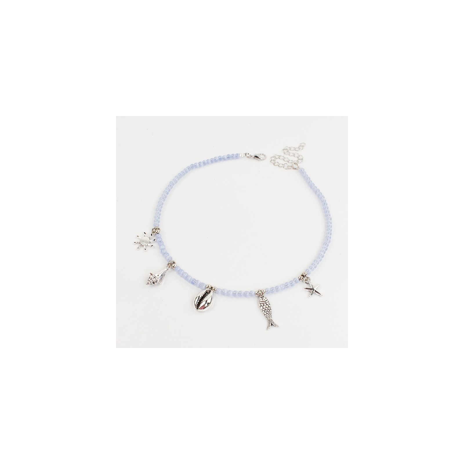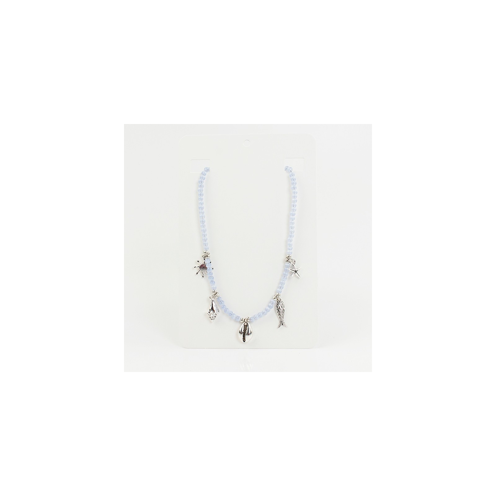 Collar flexible de lenga enhebrada con bolitas de vidrio diferenciadas, combinadas con múltiples dijes de fundición de distintas formas y tamaños.