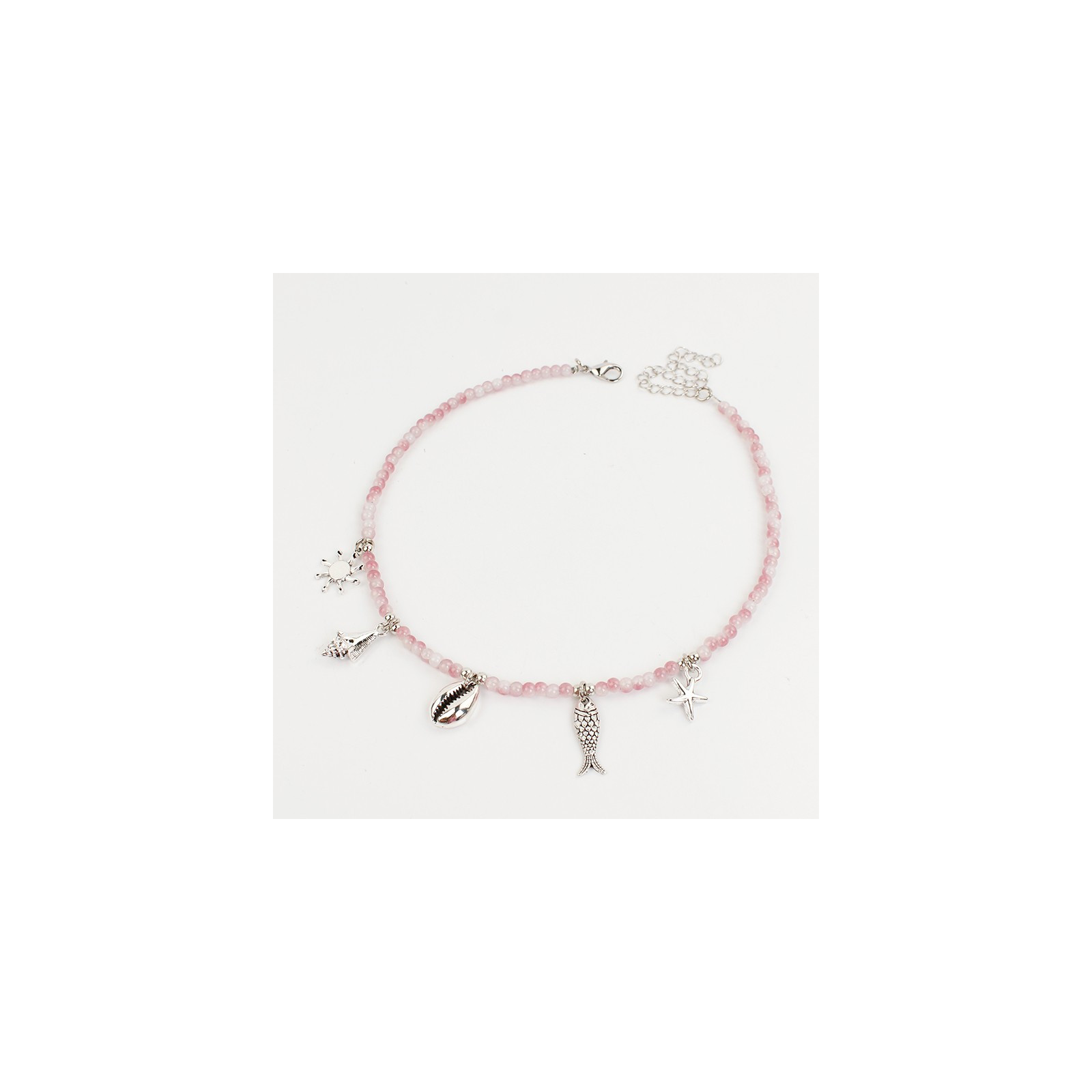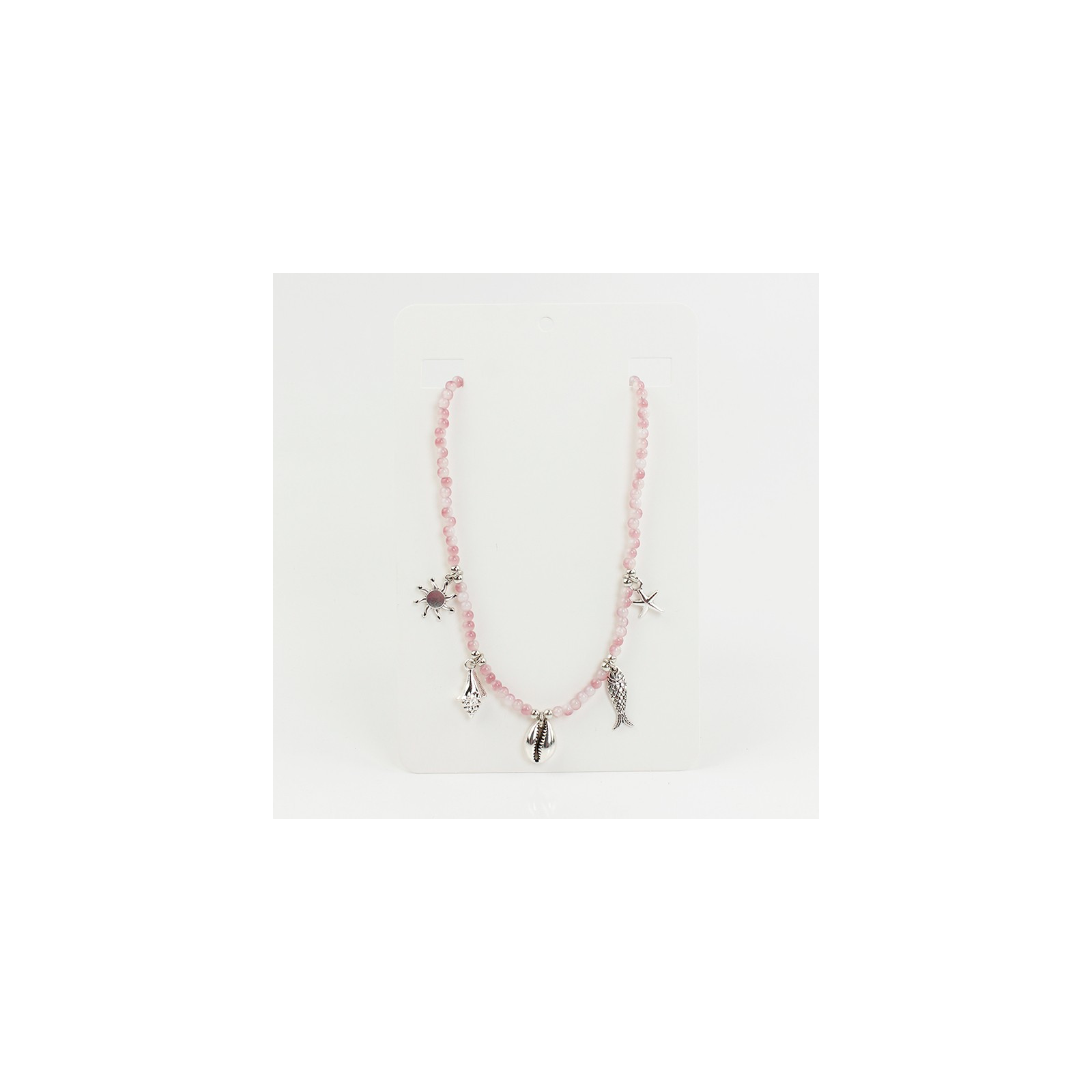 Collar flexible de lenga enhebrada con bolitas de vidrio diferenciadas, combinadas con múltiples dijes de fundición de distintas formas y tamaños.