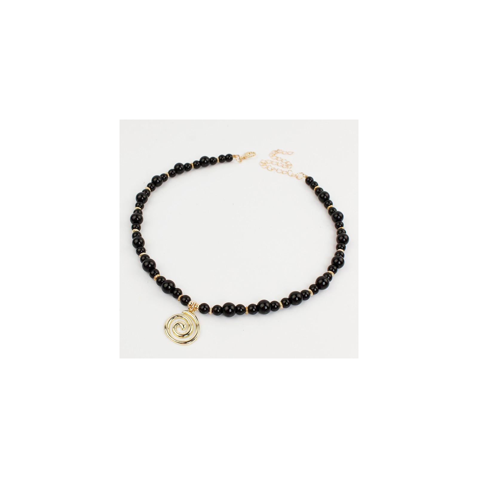 Collar flexible de lenga enhebrada con bolitas de vidrio diferenciadas de dos tamaños, combinadas con piezas de CCB exclusivas y dije de fundición.