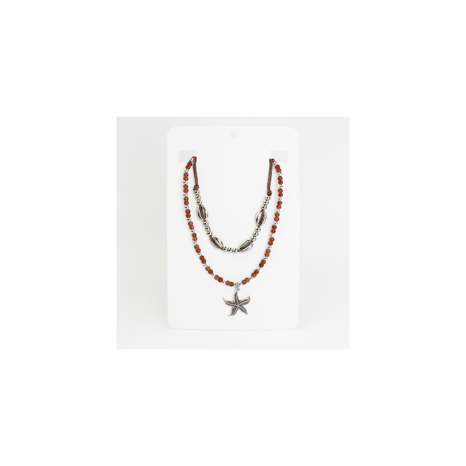 Set de dos collares flexibles, uno de lenga enhebrada con bolitas de vidrio, combinadas con separadores de CCB, otro de hilo enhebrado con buzios entrelazados.