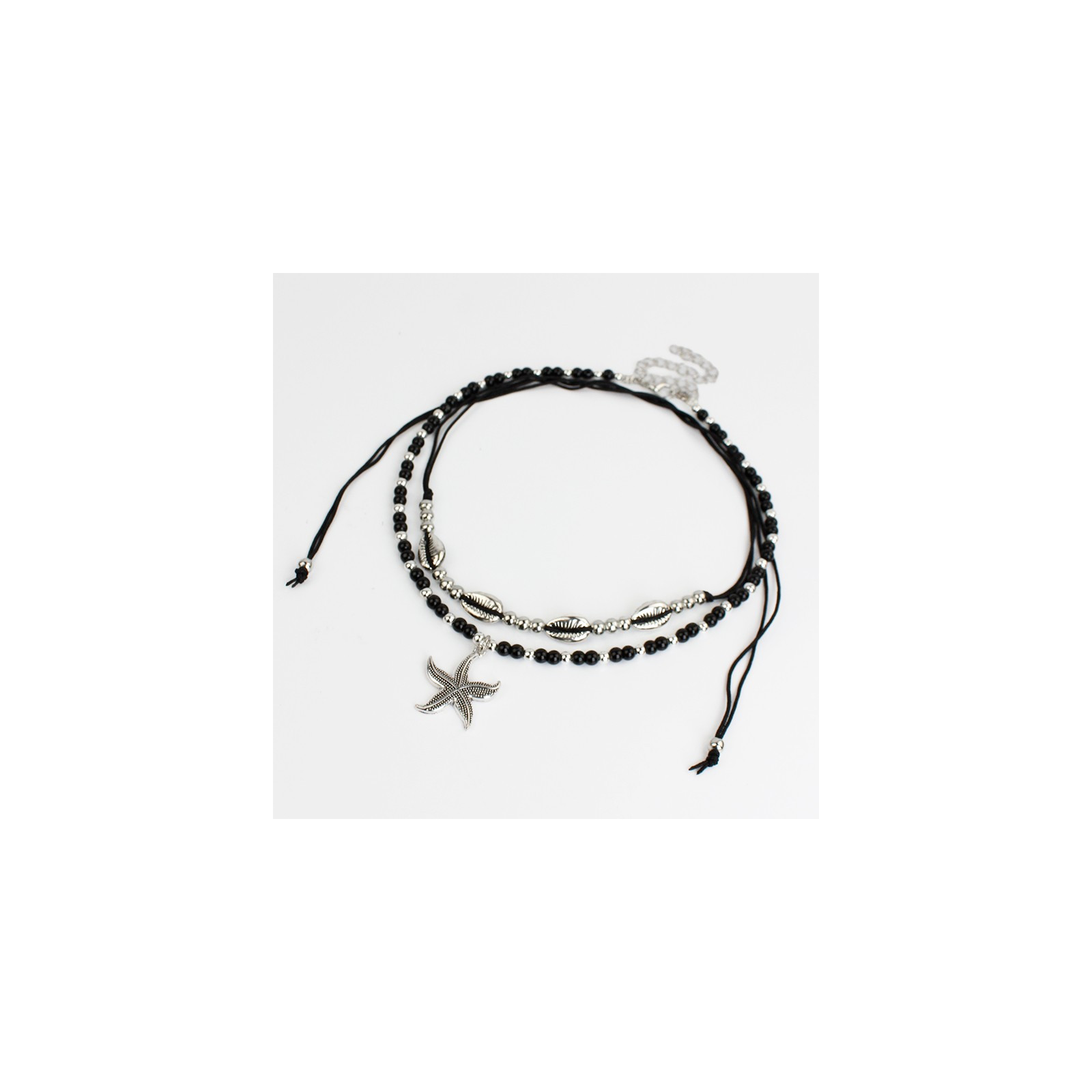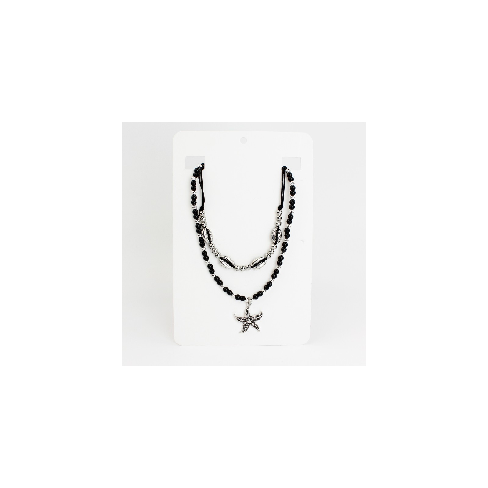 Set de dos collares flexibles, uno de lenga enhebrada con bolitas de vidrio, combinadas con separadores de CCB, otro de hilo enhebrado con buzios entrelazados.