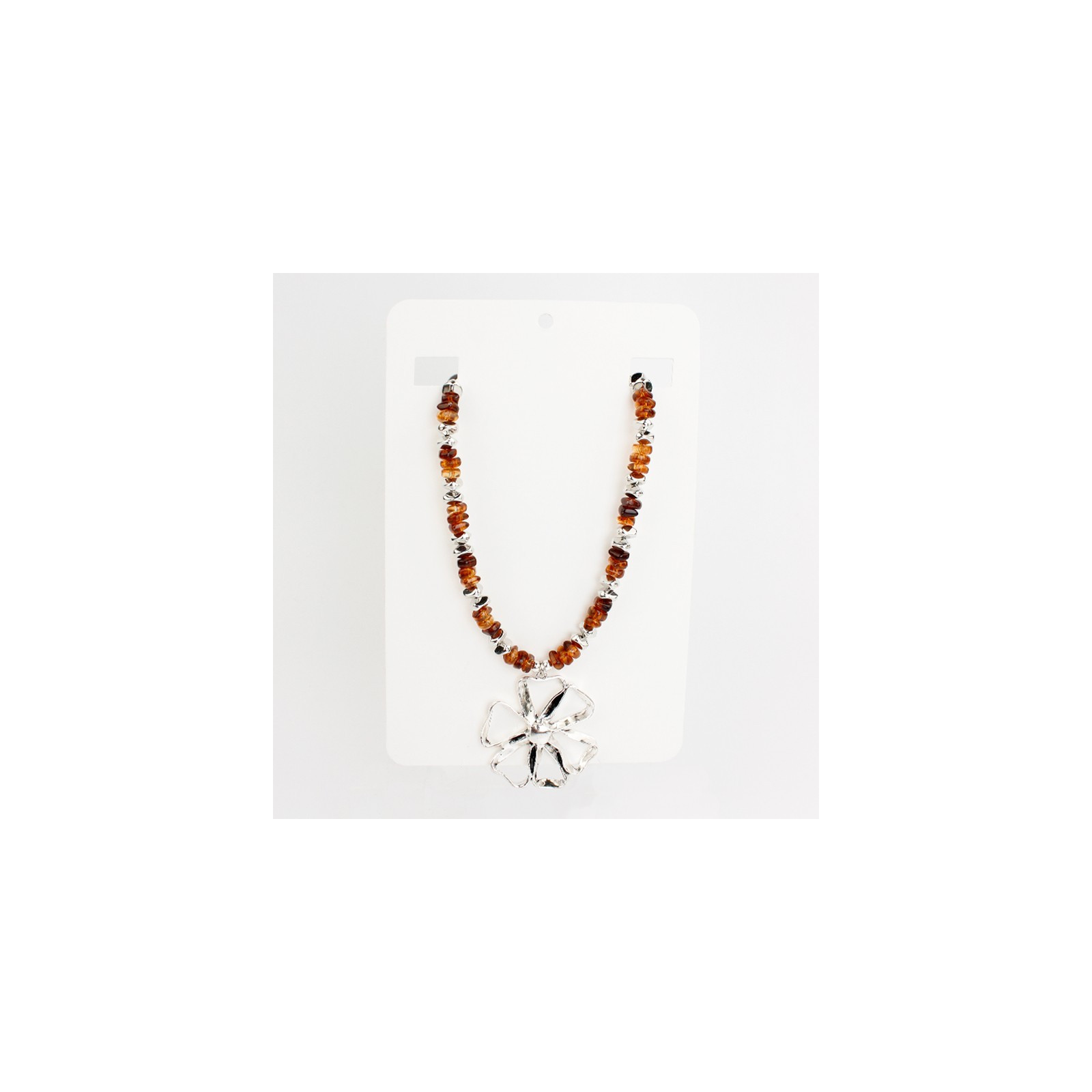 Collar flexible de lenga enhebrado con escallas de acrílico, combinadas con piezas de CCB orgánicas y dije exclusivo de fundición con forma de flor calada.