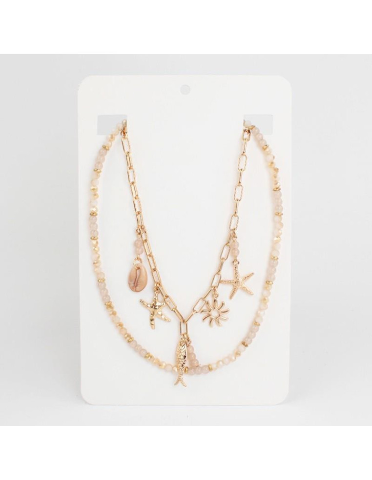 Set de dos collares, un multi dije de cadena diferenciada con dijes de fundición y bolitas de vidrio, otro flexible de lenga enhebrada con bolitas de vidrio combinados con rocas de cristal.