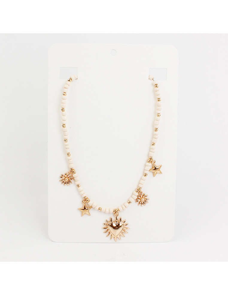 Collar multidije flexible de lenga enhebrada con mostacillas, combinadas con separadores pasantes de CCB y múltiples dijes exclusivos de fundición dorados.