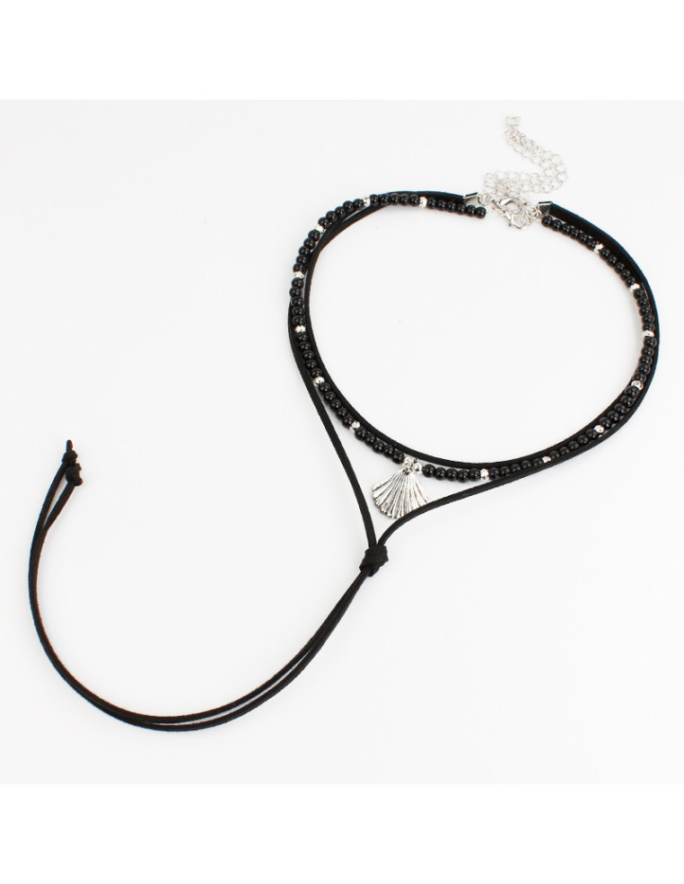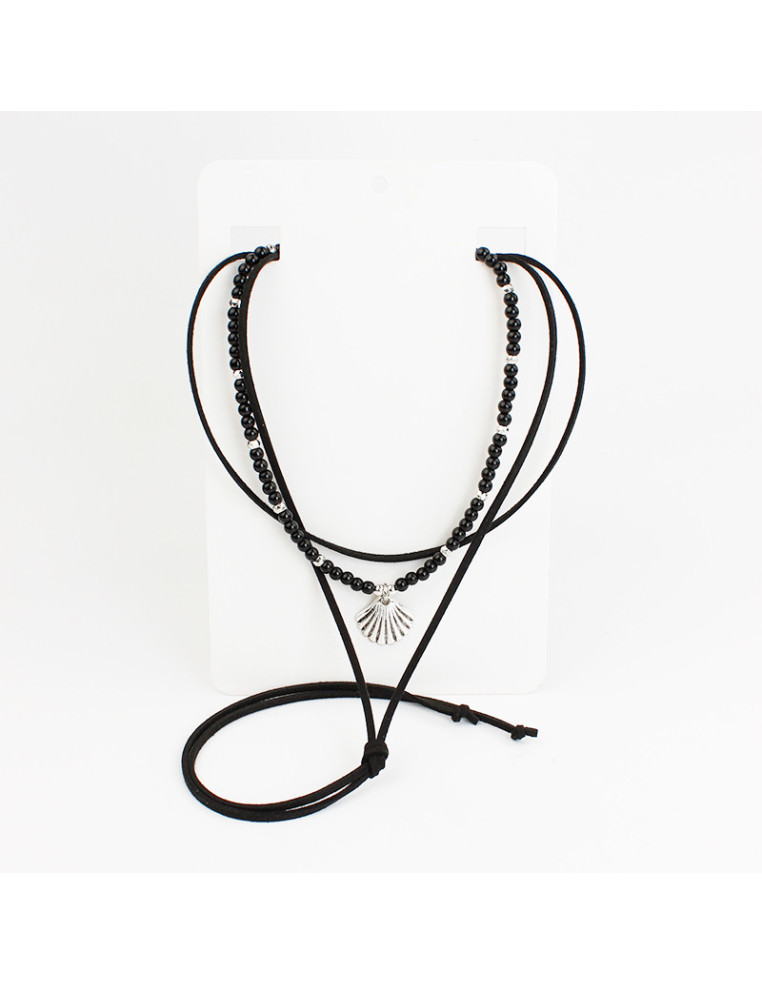 Set de dos collares, uno flexible de lenga enhebrada con bolitas de vidrio diferenciadas, combinadas con separadores de CCB y dije de fundición, otro de gamuza de doble caída.