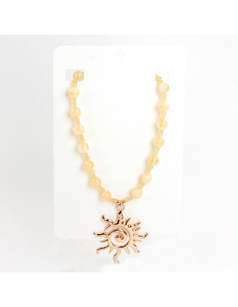 Collar flexible de lenga, enhebrado con bolitas de acrílico combinadas con mostacillas diferenciadas y dije exclusivo de fundición con forma de sol.