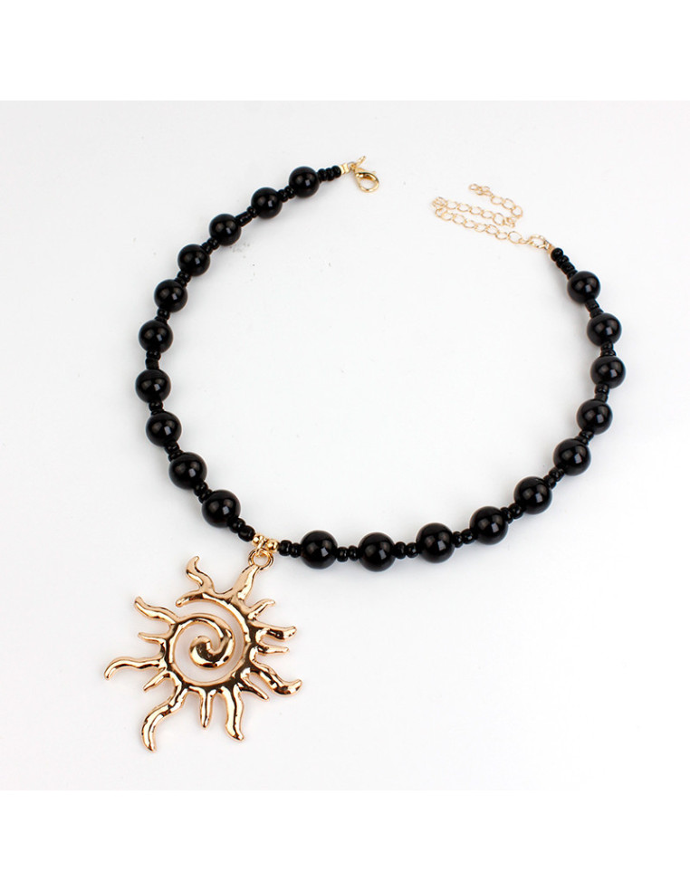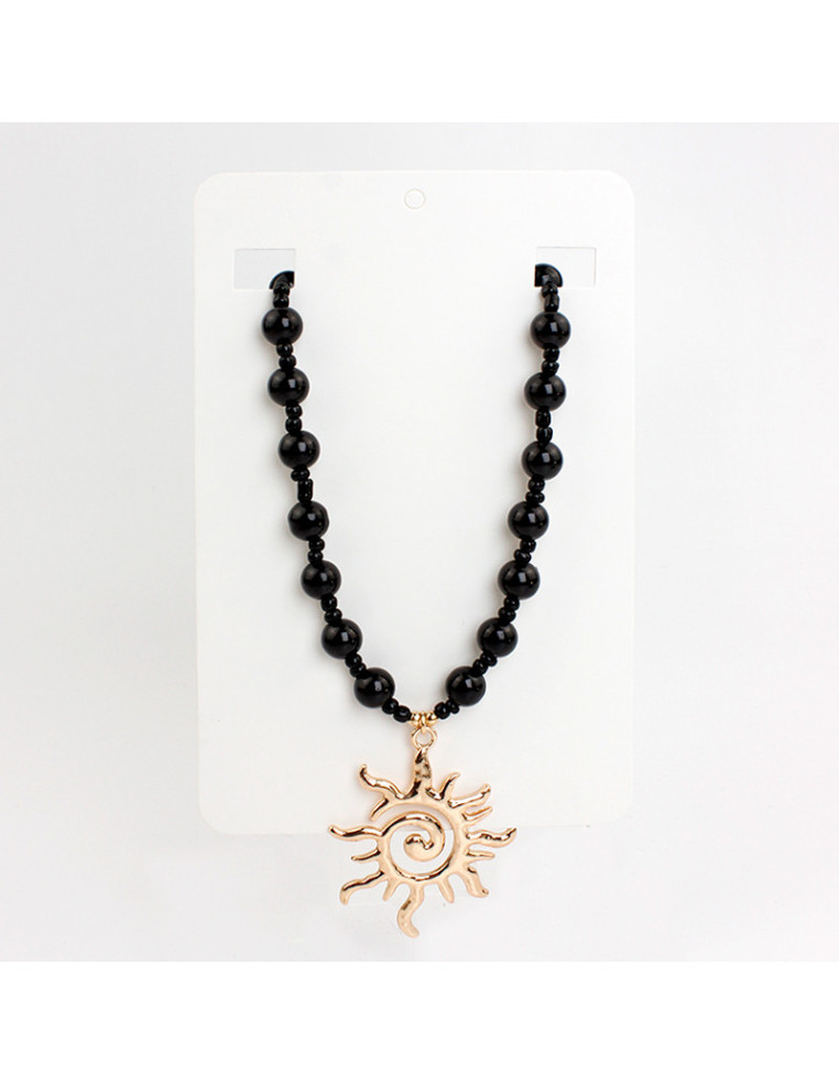 Collar flexible de lenga, enhebrado con bolitas de acrílico combinadas con mostacillas diferenciadas y dije exclusivo de fundición con forma de sol.