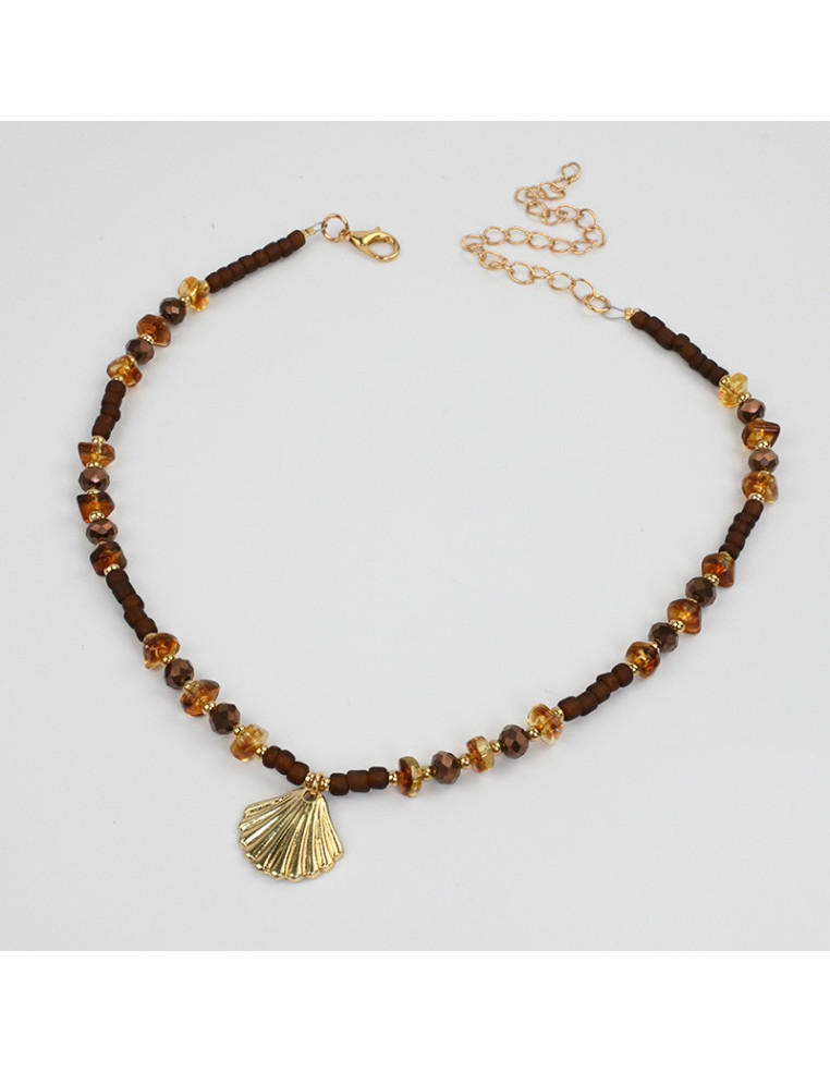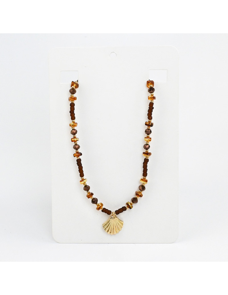 Collar flexible de lenga enhebrada con escallas de acrílico, combinadas con mostacillas, rocas de cristal y dije exclusivo de fundición con forma de sol.