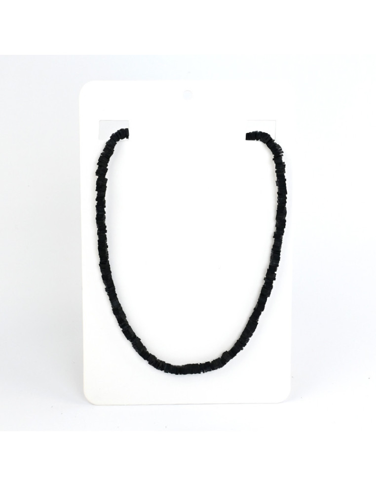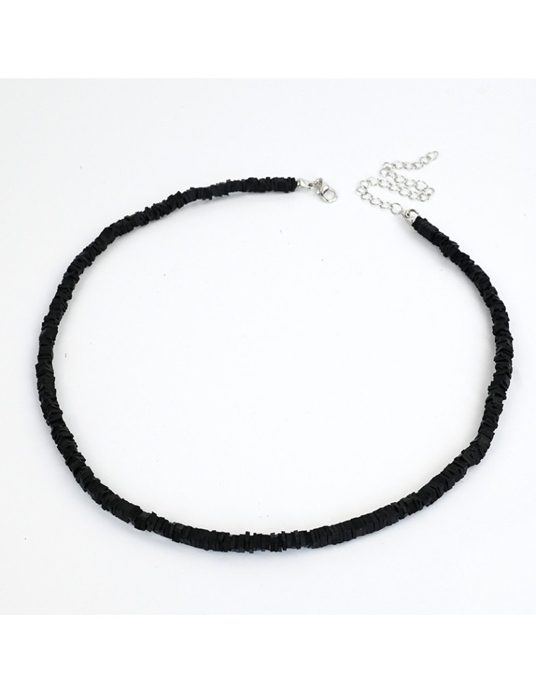 Collar flexible de tanza elástica enhebrada con piezas de fimo cuadradas.