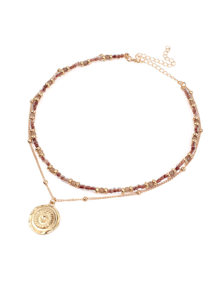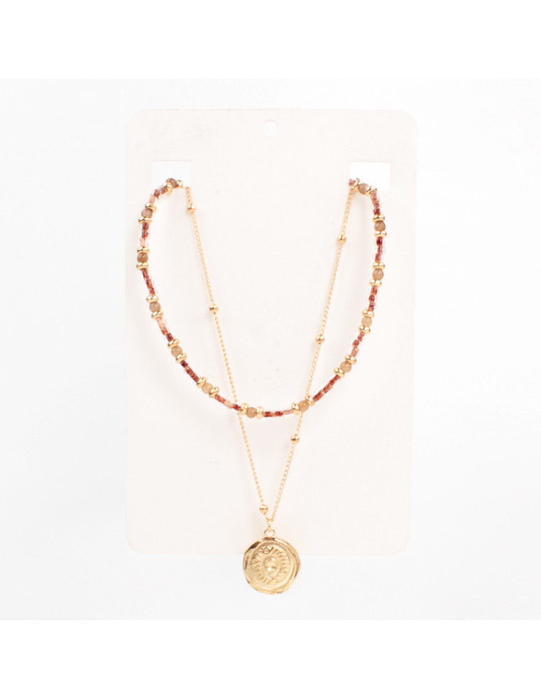 Collar combinado de cadena diferenciada, con dije exclusivo de fundición, otro de lenga enhebrado con mostacillas, combinadas con bolitas de vidrio diferenciadas y seoaradoes de CCB.