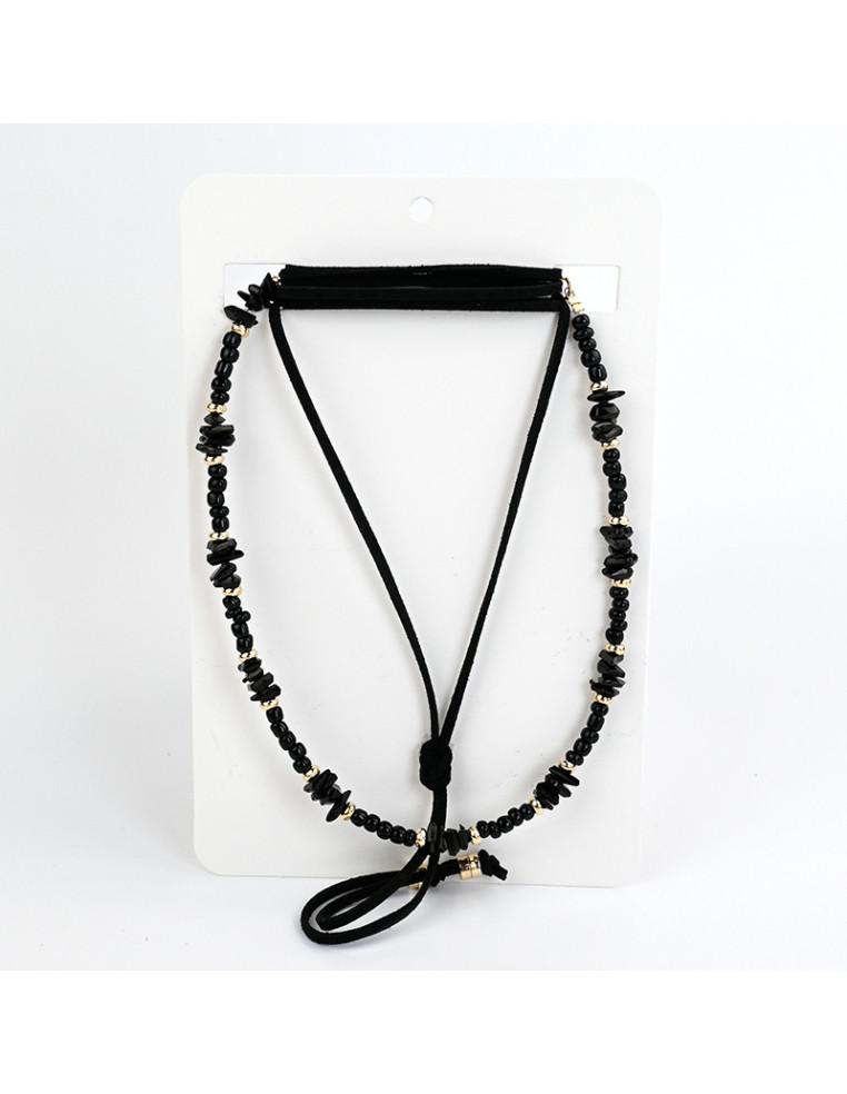 Set de dos collares. uno de lenga enhebrado con mostacillas, escallas de acrílico y separadores de CCB, con collar de gamuza de múltiples vueltas y terminales en punteras.