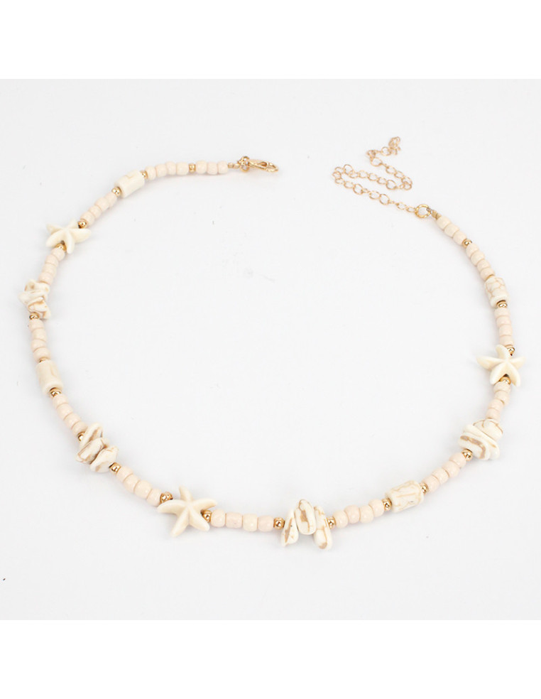 Collar flexible de lenga, con mostacillas, escallas naturales y dijes de roca reconstruida.